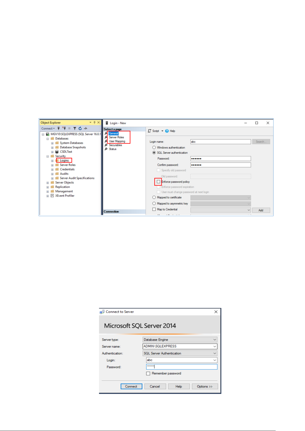 - Chọn SQL Server Authentication: pass:123456, repass - Bỏ chọn policy + Server Roles: - Chọn: sysadmin