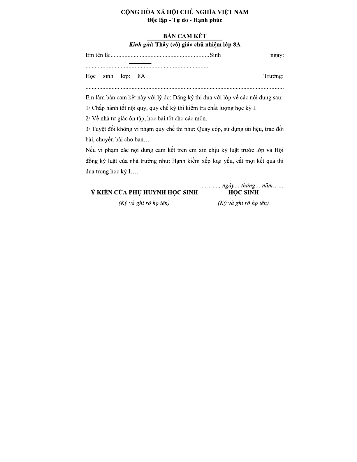 Bản Cam Kết Không Vi Phạm Quy Chế Thi Lớp 8A