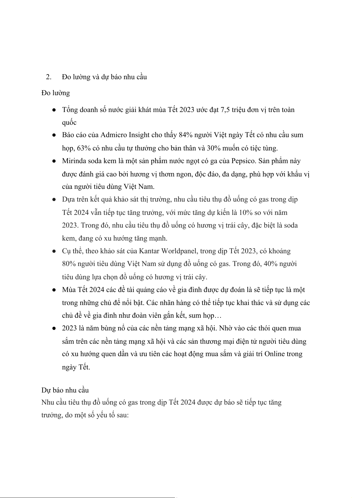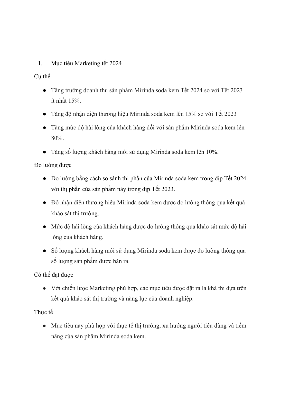 ● Tăng trưởng doanh thu sản phẩm Mirinda soda kem Tết 2024 so với Tết 2023 ít nhất 15%.