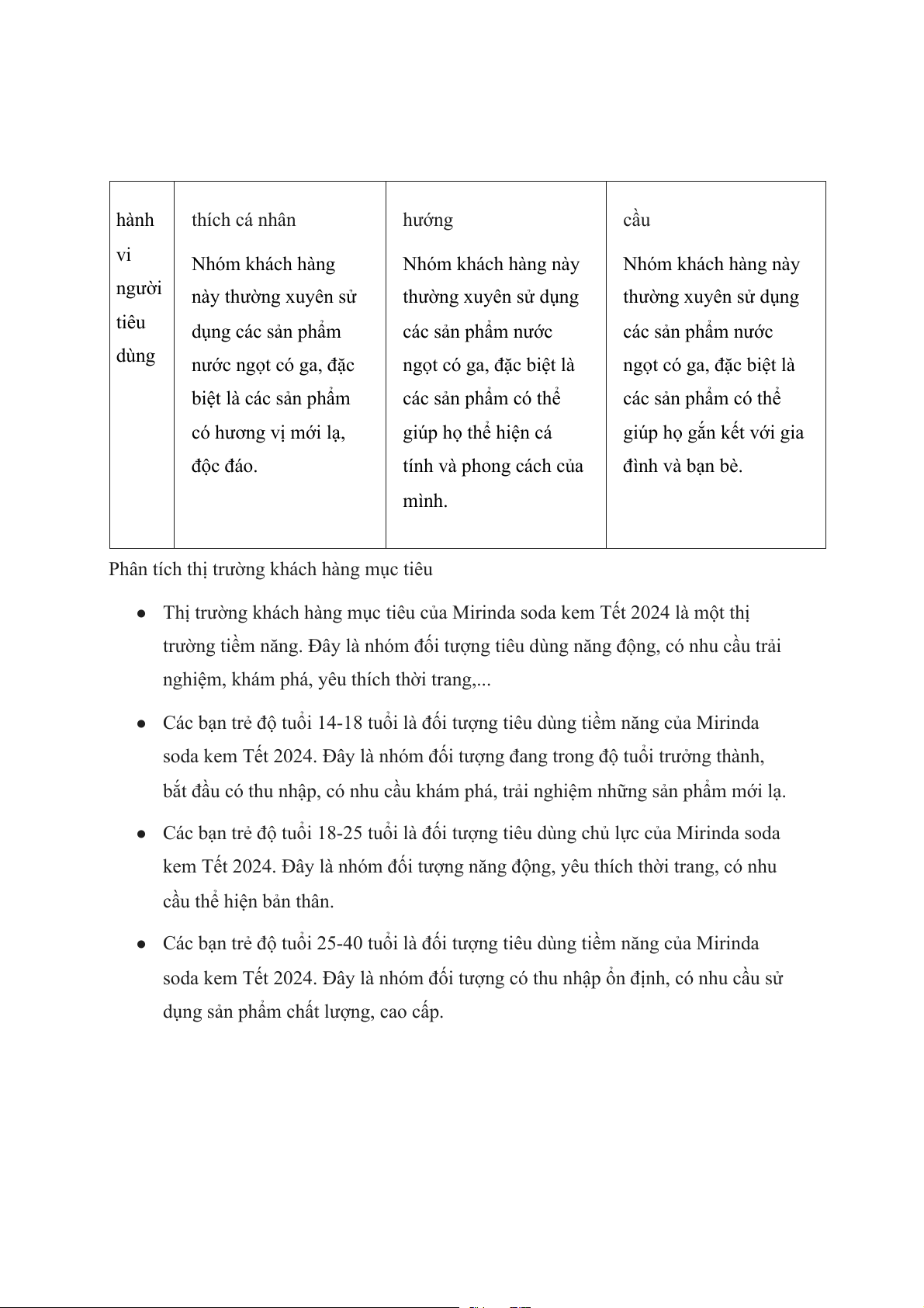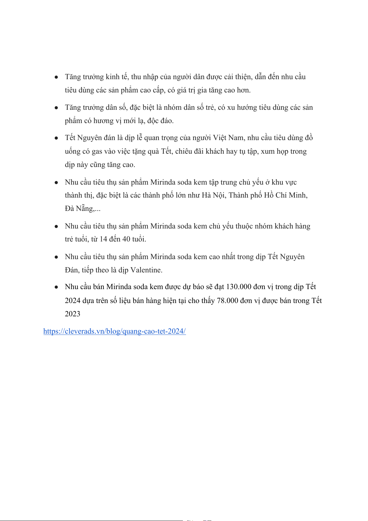 ● Thị trường khách hàng mục tiêu của Mirinda soda kem Tết 2024 là một thị