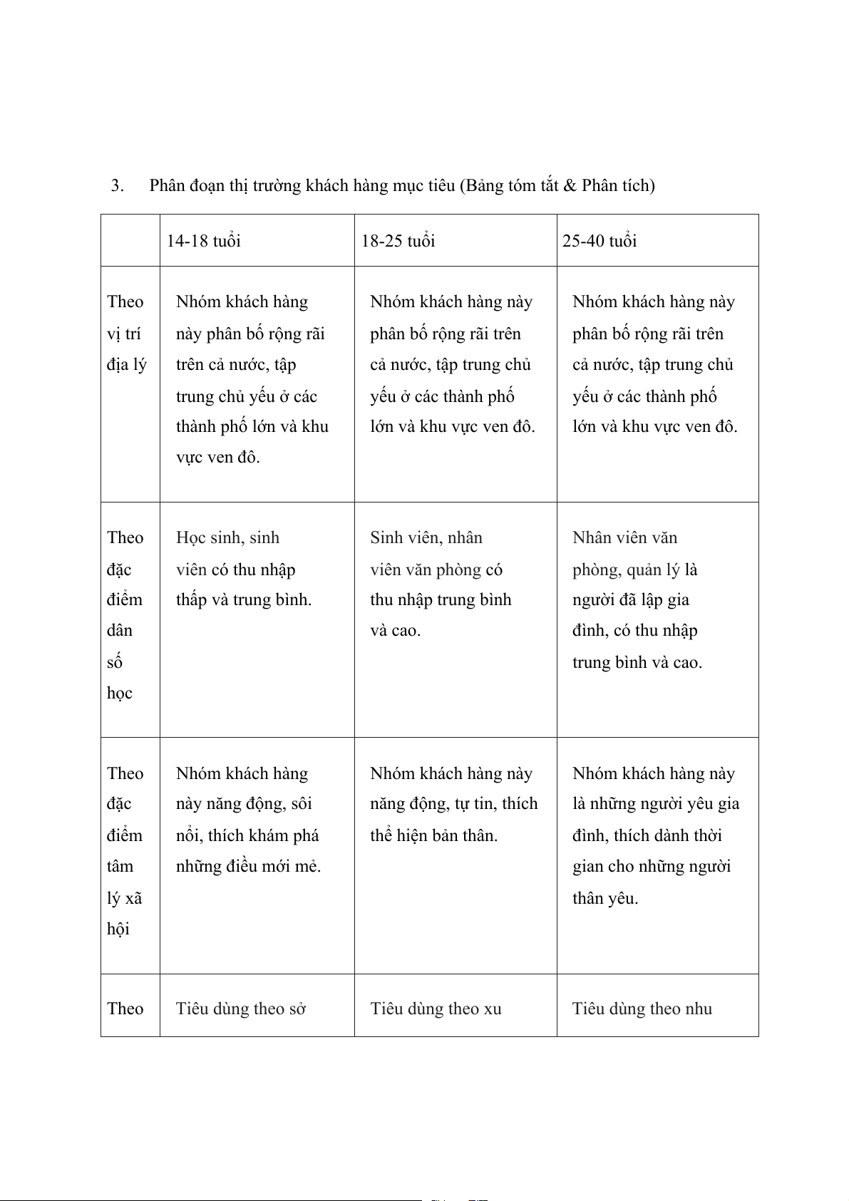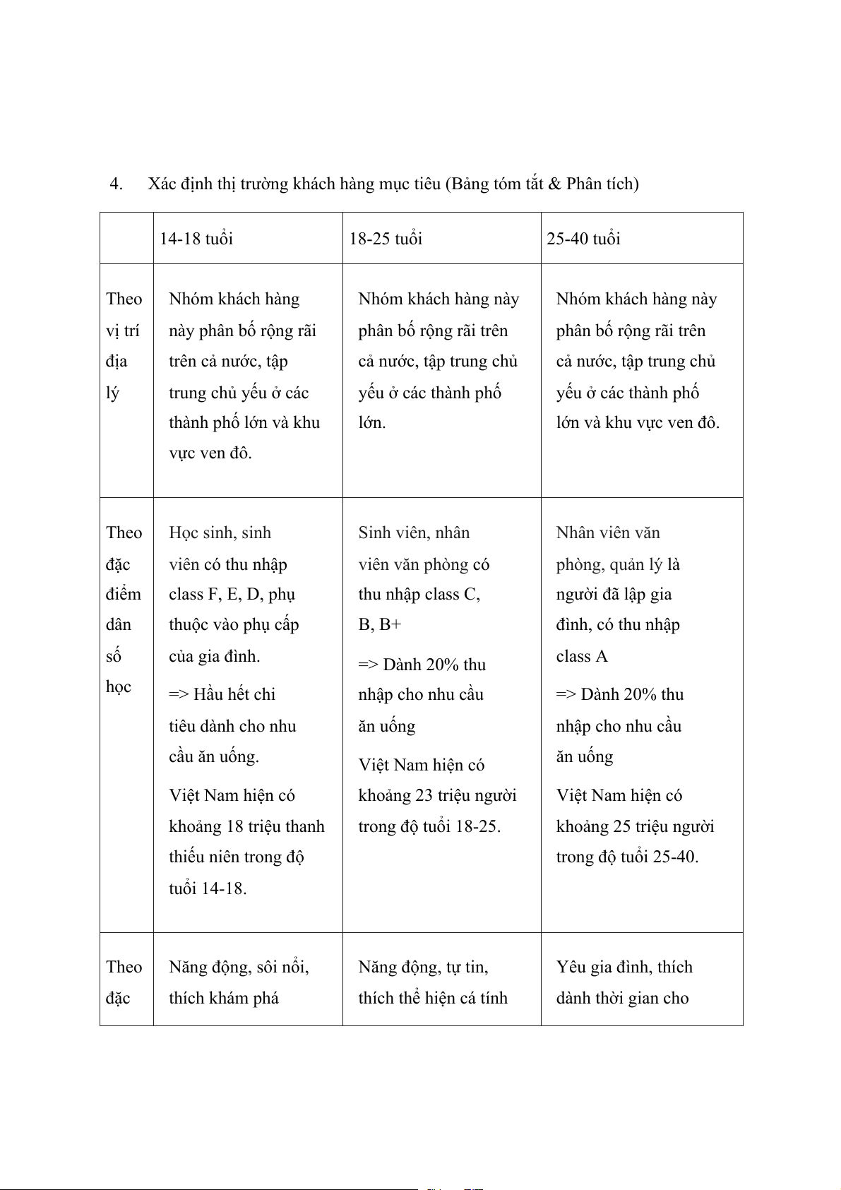 cả nước, tập trung chủ lý trung chủ yếu ở các yếu ở các thành phố yếu ở các thành phố thành phố lớn và khu lớn. lớn và khu vực ven đô. vực ven đô. Theo Học sinh, sinh Sinh viên, nhân Nhân viên văn đặc viên có thu nhập viên văn phòng có phòng, quản lý là điểm class F, E, D, phụ thu nhập class C, người đã lập gia dân thuộc vào phụ cấp B, B+ đình, có thu nhập số của gia đình. => Dành 20% thu class A học => Hầu hết chi nhập cho nhu cầu => Dành 20% thu tiêu dành cho nhu ăn uống nhập cho nhu cầu cầu ăn uống. Việt Nam hiện có ăn uống Việt Nam hiện có khoảng 23 triệu người Việt Nam hiện có khoảng 18 triệu thanh trong độ tuổi 18-25. khoảng 25 triệu người thiếu niên trong độ trong độ tuổi 25-40. tuổi 14-18. Theo Năng động, sôi nổi, Năng động, tự tin, Yêu gia đình, thích đặc thích khám phá thích thể hiện cá tính dành thời gian cho