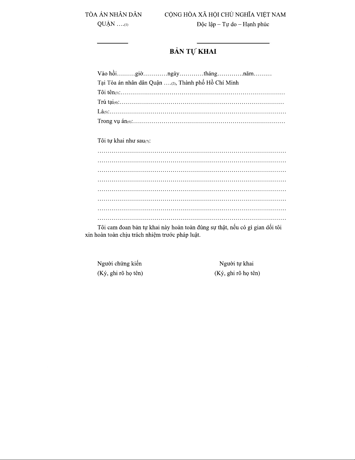 BẢN TỰ KHAI CỦA NGƯỜI THAM GIA TỐ TỤNG TẠI TÒA ÁN