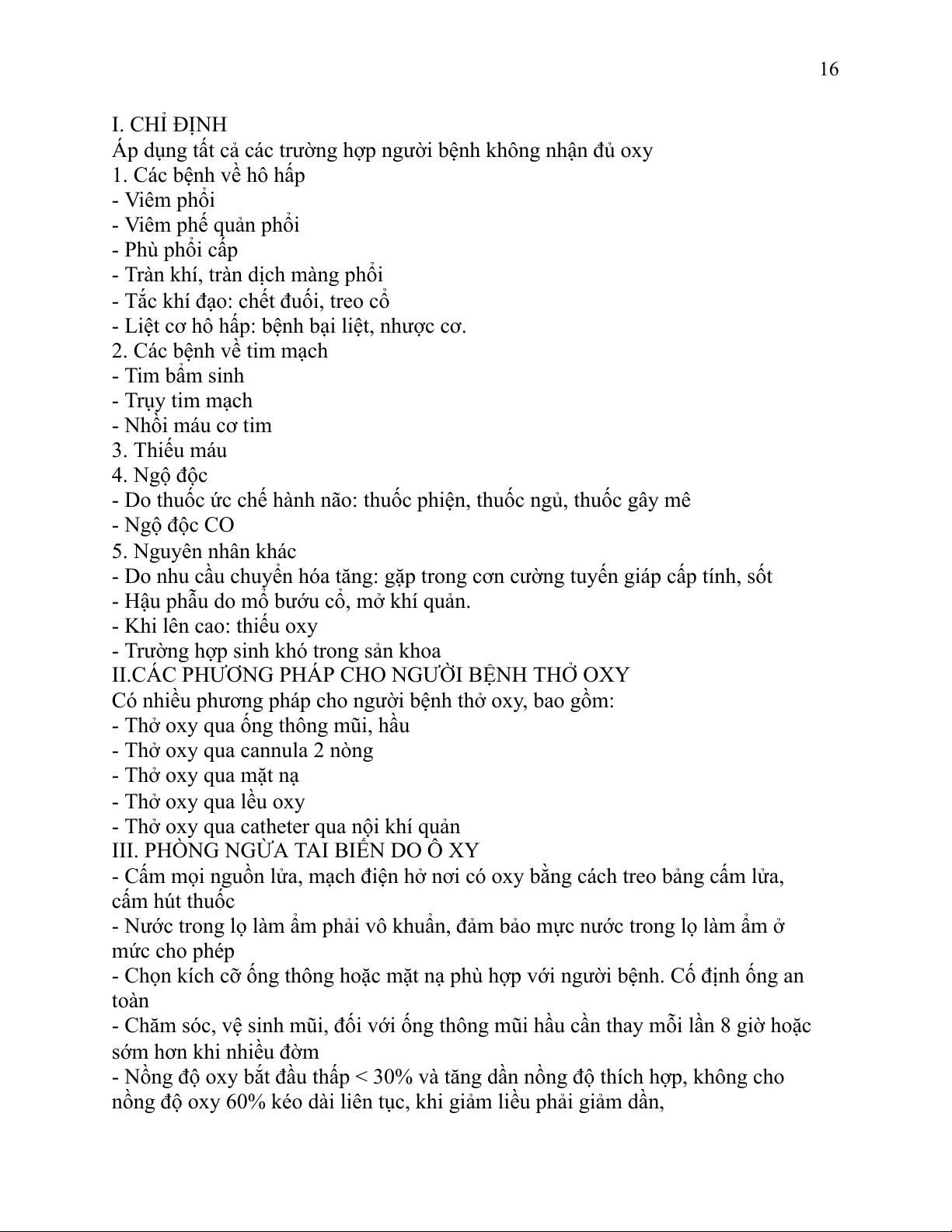 Tuy nhiên trường hợp cấp cứu, Điều dưỡng có thể cho người bệnh thở oxy theo nhu cầu. 16 I. CHỈ ĐỊNH