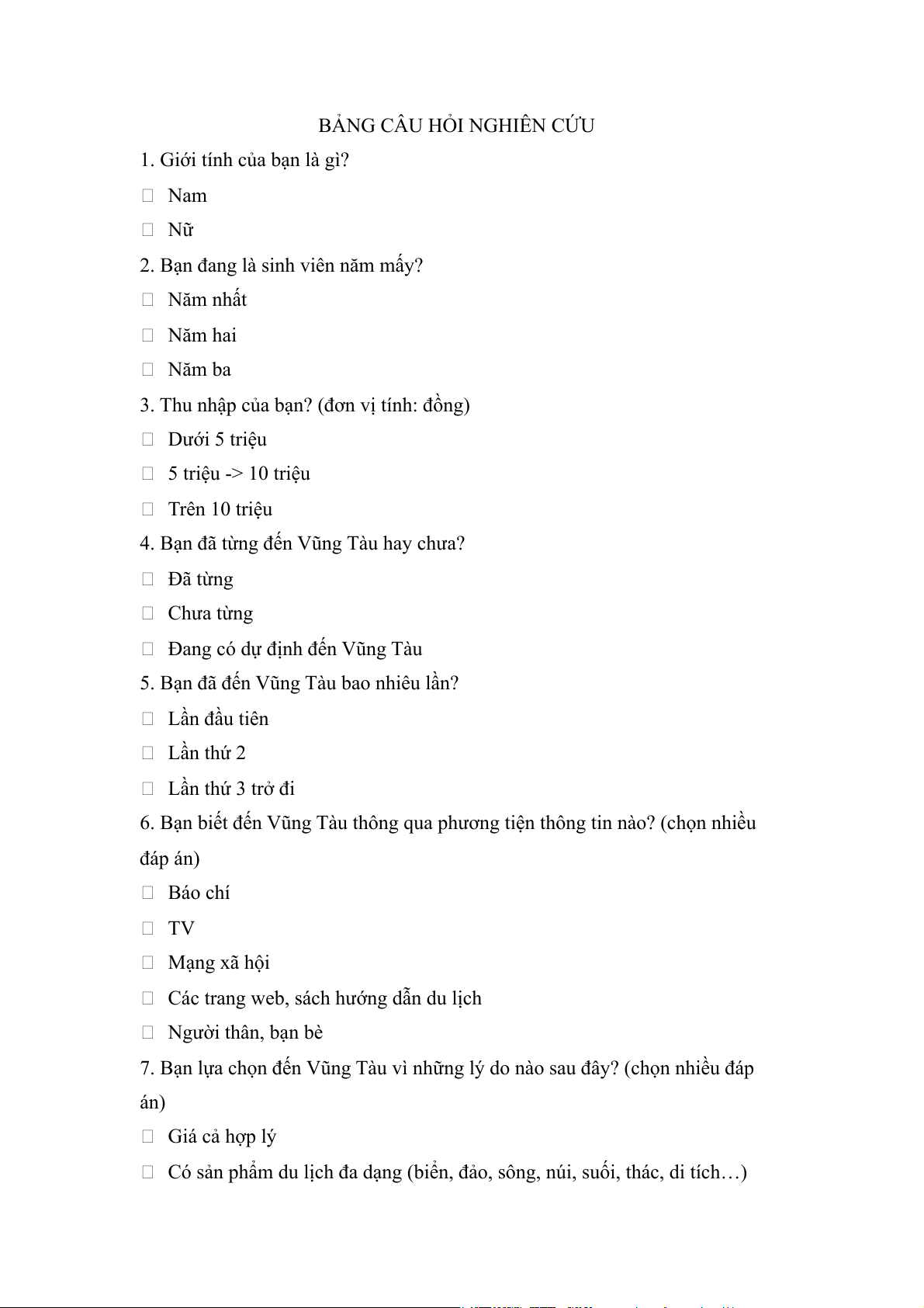 BẢNG CÂU HỎI NGHIÊN CỨU