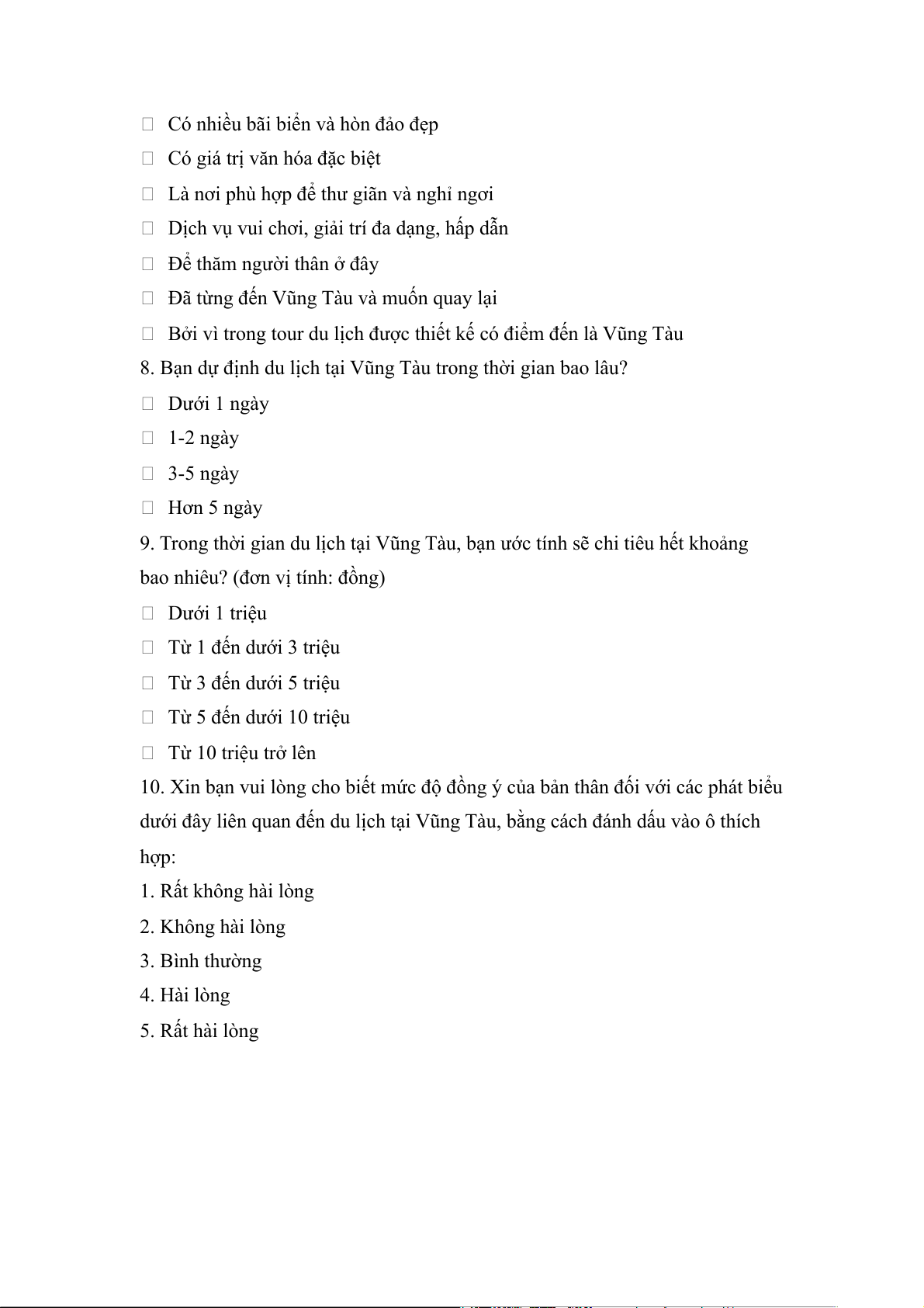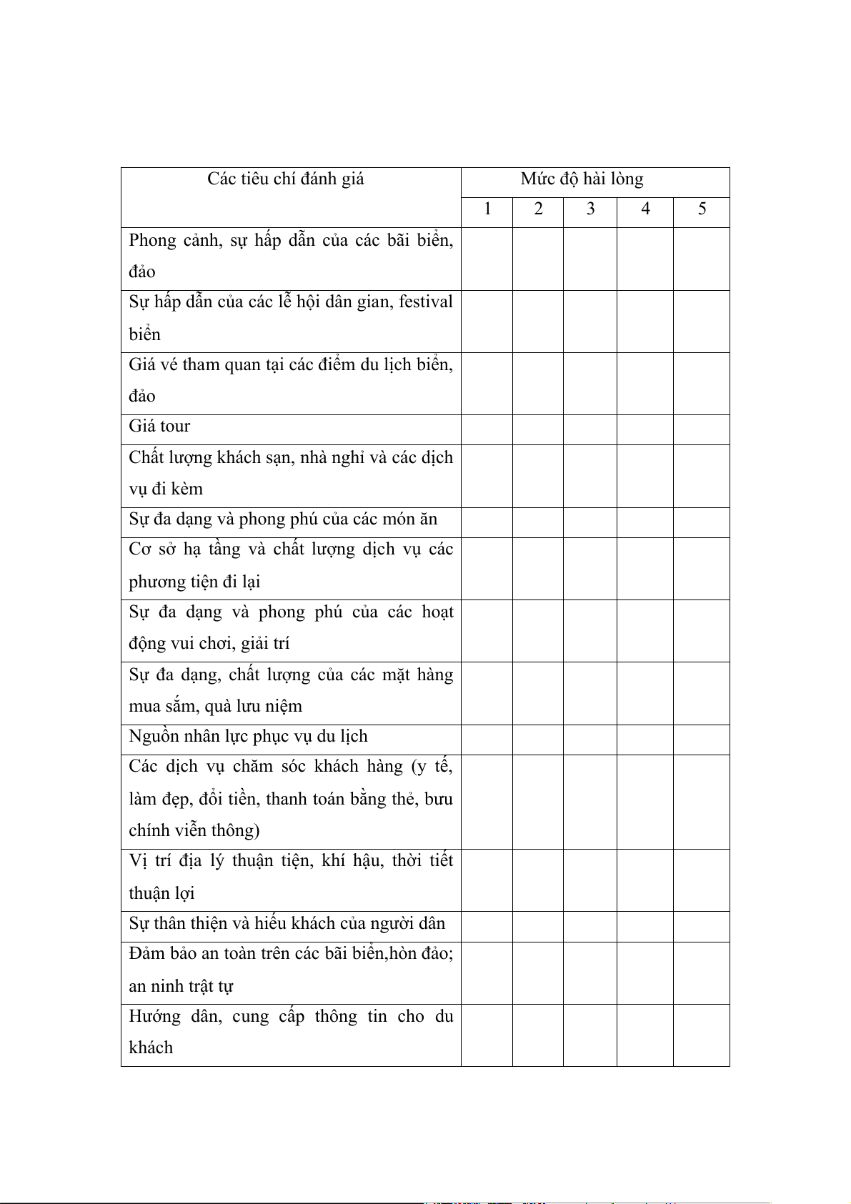 dưới đây liên quan đến du lịch tại Vũng Tàu, bằng cách đánh dấu vào ô thích hợp: 1. Rất không hài lòng 2. Không hài lòng 3. Bình thường 4. Hài lòng 5. Rất hài lòng Các tiêu chí đánh giá Mức độ hài lòng 1 2 3 4 5