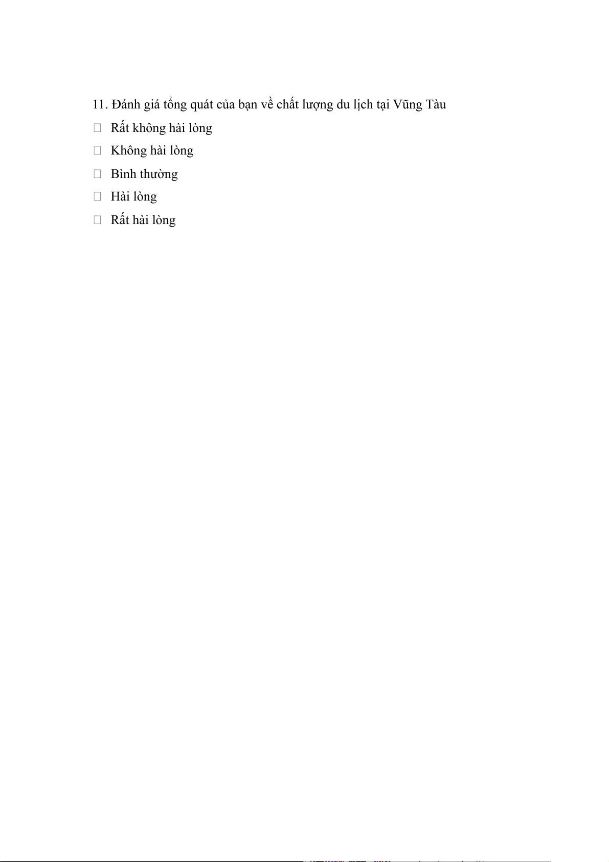 11. Đánh giá tổng quát của bạn về chất lượng du lịch tại Vũng Tàu Rất không hài lòng Không hài lòng Bình thường Hài lòng Rất hài lòng