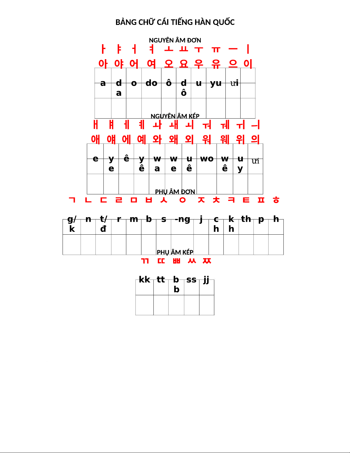 BẢNG CHỮ CÁI TIẾNG HÀN QUỐC: NGUYÊN ÂM & PHỤ ÂM ĐƠN, KÉP