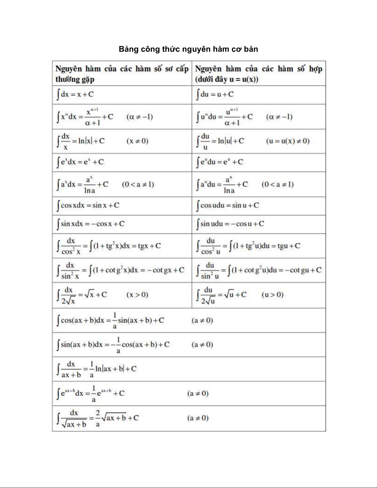 Bảng công thức nguyên hàm cơ bản