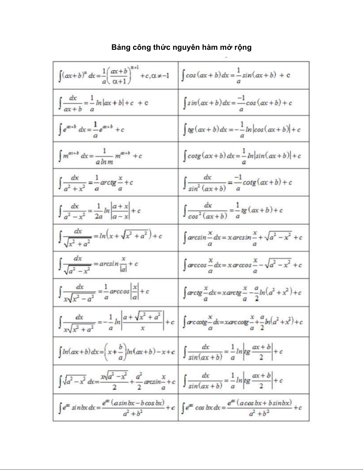 Bảng công thức nguyên hàm mở rộng