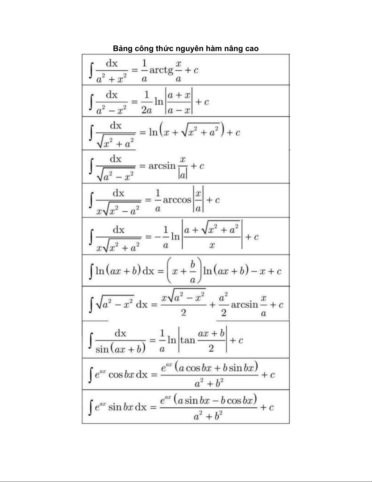 Bảng công thức nguyên hàm nâng cao