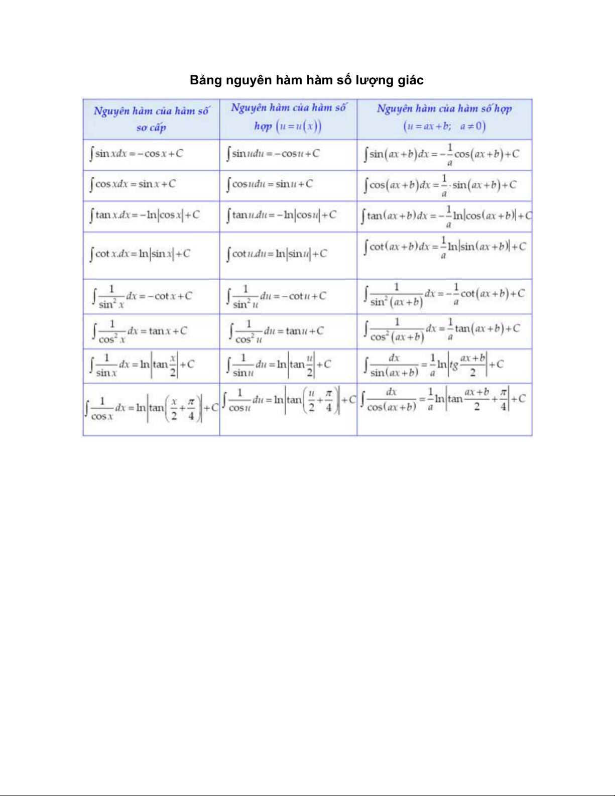 Bảng nguyên hàm hàm số l ợ ư ng giác