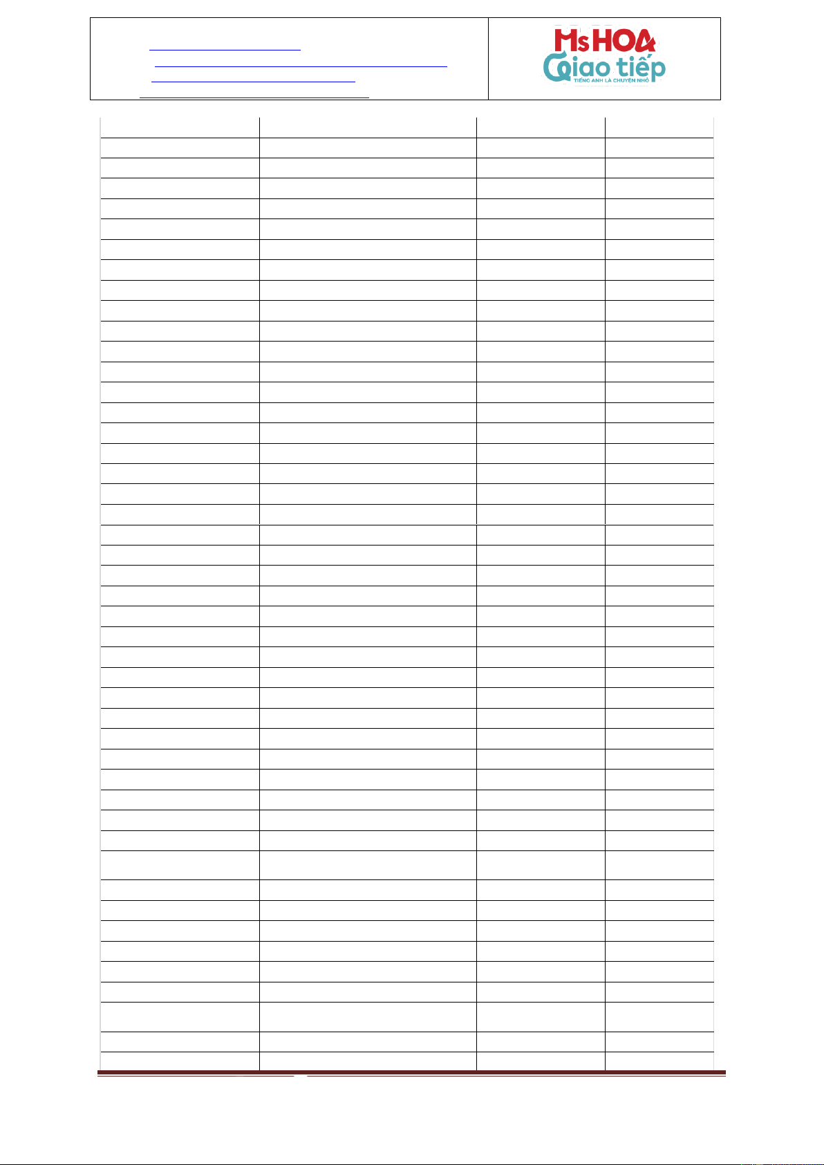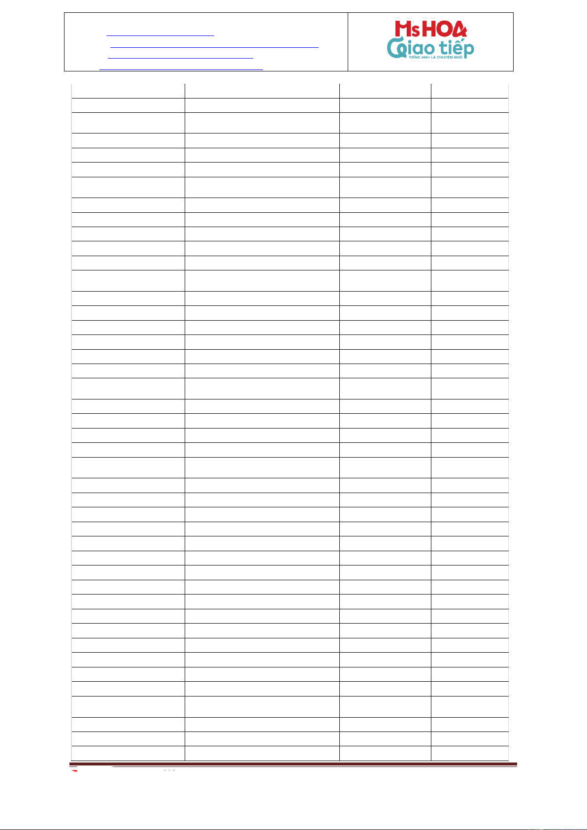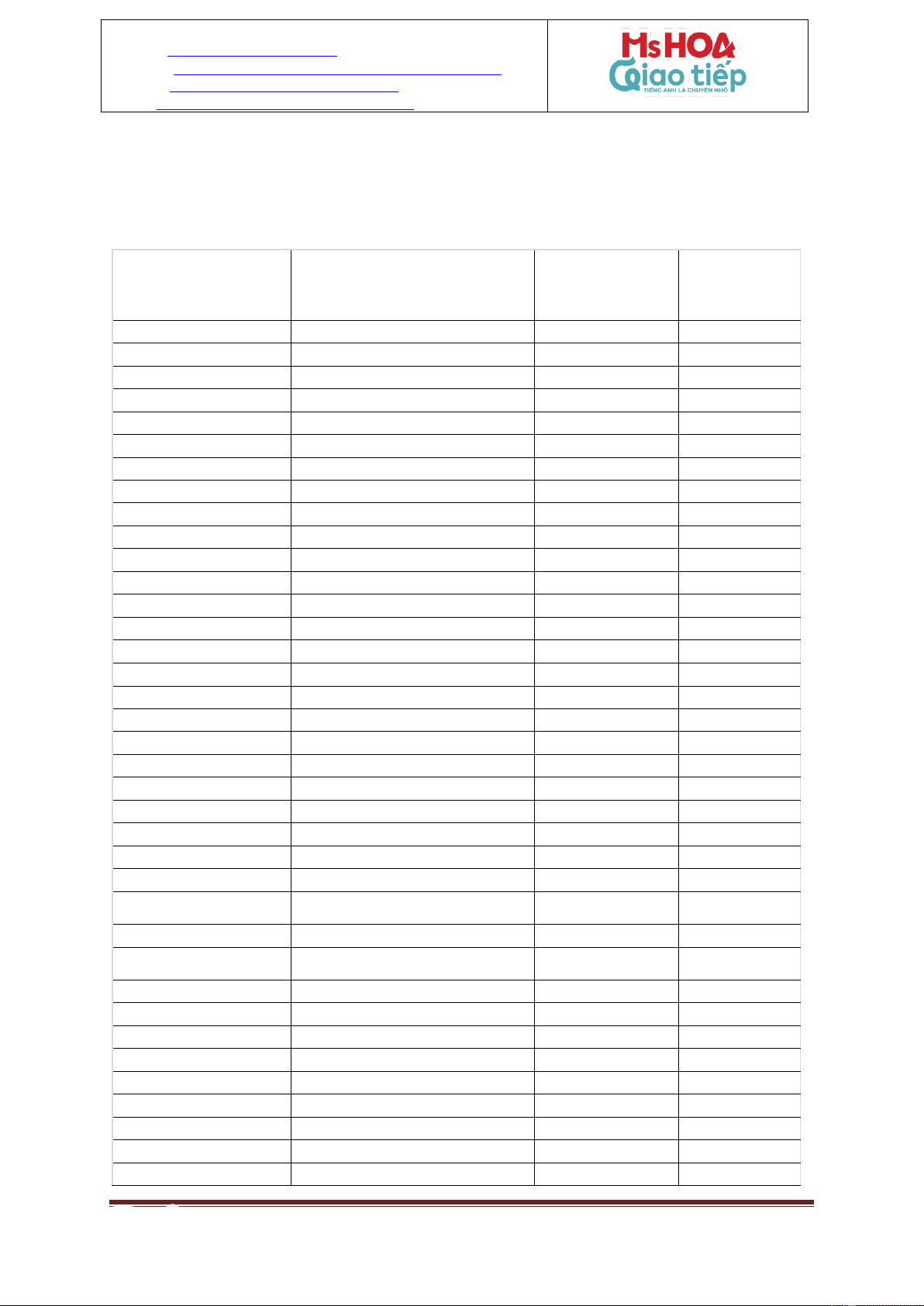 Tiktok: tiktok.com/@mshoagiaotiep?lang=vi-VN stick stuck stuck ghim vào; đính châm ; chích; sting stung stung đốt stink stunk/ stank stunk bốc mùi hôi strew strewed strewn/ strewed rắc , rải stride strode stridden bước sải strike struck struck đánh đập string strung strung gắn dây vào strive strove striven cố sức swear swore sworn tuyên thệ sweep swept swept quét swell swelled swollen/ swelled phồng; sưng swim swam swum bơi lội swing swung swung đong đưa take took taken cầm ; lấy teach taught taught dạy ; giảng dạy tear tore torn xé; rách tell told told kể ; bảo think thought thought suy nghĩ throw threw thrown ném ; liệng thrust thrust thrust thọc ;nhấn tread trod trodden/ trod giẫm ; đạp unbend unbent unbent làm thẳng lại undercut undercut undercut ra giá rẻ hơn undergo underwent undergone kinh qua underlie underlay underlain nằm dưới underpay underpaid underpaid trả lương thấp undersell undersold undersold bán rẻ hơn understand understood understood hiểu undertake undertook undertaken đảm nhận underwrite underwrote underwritten bảo hiểm undo undid undone tháo ra unfreeze unfroze unfrozen làm tan đông unwind unwound unwound tháo ra uphold upheld upheld ủng hộ upset upset upset đánh đổ; lật đổ wake woke/ waked woken/ waked thức giấc waylay waylaid waylaid mai phục wear wore worn mặc weave wove/ weaved woven/ weaved dệt wed wed/ wedded wed/ wedded kết hôn weep wept wept khóc wet wet / wetted wet / wetted làm ướt thắng ; chiến win won won thắng wind wound wound quấn withdraw withdrew withdrawn rút lui Ms Hoa Giao tiếp Page 5