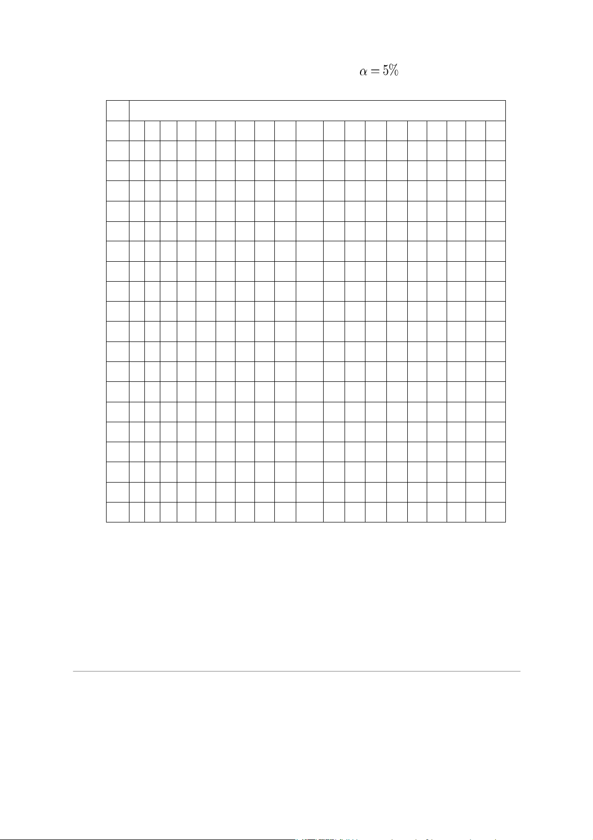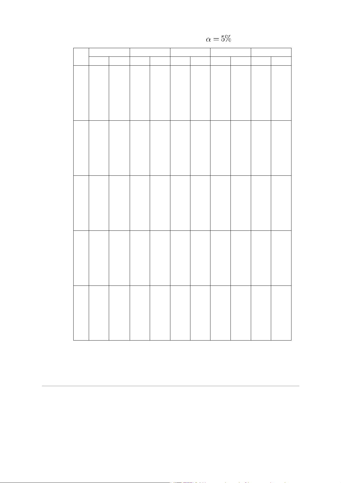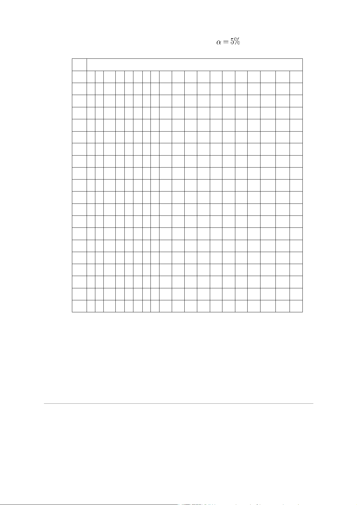 0.01 16.26 13.27 12.06 11.39 10.97 10.67 10.46 0.1 3.78 3.46 3.29 3.18 3.11 3.05 3.01 6 0.05 5.99 5.14 4.76 4.53 4.39 4.28 4.21 0.01 13.75 10.92 9.78 9.15 8.75 8.47 8.26 0.1 3.59 3.26 3.07 2.96 2.88 2.83 2.78 7 0.05 5.59 4.74 4.35 4.12 3.97 3.87 3.79 0.01 12.25 9.55 8.45 7.85 7.46 7.19 6.99 0.1 3.46 3.11 2.92 2.81 2.73 2.67 2.62 8 0.05 5.32 4.46 4.07 3.84 3.69 3.58 3.50 0.01 11.26 8.65 7.59 7.01 6.63 6.37 6.18 0.1 3.36 3.01 2.81 2.69 2.61 2.55 2.51 9 0.05 5.12 4.26 3.86 3.63 3.48 3.37 3.29 0.01 10.56 8.02 6.99 6.42 6.06 5.80 5.61 0.1 3.29 2.92 2.73 2.61 2.52 2.46 2.41 10 0.05 4.96 4.10 3.71 3.48 3.33 3.22 3.14 0.01 10.04 7.56 6.55 5.99 5.64 5.39 5.20 0.1 3.23 2.86 2.66 2.54 2.45 2.39 2.34 11 0.05 4.84 3.98 3.59 3.36 3.20 3.09 3.01 0.01 9.65 7.21 6.22 5.67 5.32 5.07 4.89 0.1 3.18 2.81 2.61 2.48 2.39 2.33 2.28 12 0.05 4.75 3.89 3.49 3.26 3.11 3.00 2.91 0.01 9.33 6.93 5.95 5.41 5.06 4.82 4.64 0.1 3.14 2.76 2.56 2.43 2.35 2.28 2.23 13 0.05 4.67 3.81 3.41 3.18 3.03 2.92 2.83 0.01 9.07 6.70 5.74 5.21 4.86 4.62 4.44 0.1 3.10 2.73 2.52 2.39 2.31 2.24 2.19 14 0.05 4.60 3.74 3.34 3.11 2.96 2.85 2.76 0.01 8.86 6.51 5.56 5.04 4.69 4.46 4.28 0.1 3.07 2.70 2.49 2.36 2.27 2.21 2.16 15 0.05 4.54 3.68 3.29 3.06 2.90 2.79 2.71 0.01 8.68 6.36 5.42 4.89 4.56 4.32 4.14 5 n1 n2 α 1 2 3 4 5 6 7 0.1 3.05 2.67 2.46 2.33 2.24 2.18 2.13 16 0.05 4.49 3.63 3.24 3.01 2.85 2.74 2.66 0.01 8.53 6.23 5.29 4.77 4.44 4.20 4.03 0.1 3.03 2.64 2.44 2.31 2.22 2.15 2.10 17 0.05 4.45 3.59 3.20 2.96 2.81 2.70 2.61 0.01 8.40 6.11 5.18 4.67 4.34 4.10 3.93 0.1 3.01 2.62 2.42 2.29 2.20 2.13 2.08 18 0.05 4.41 3.55 3.16 2.93 2.77 2.66 2.58 0.01 8.29 6.01 5.09 4.58 4.25 4.01 3.84 0.1 2.99 2.61 2.40 2.27 2.18 2.11 2.06 19 0.05 4.38 3.52 3.13 2.90 2.74 2.63 2.54 0.01 8.18 5.93 5.01 4.50 4.17 3.94 3.77 0.1 2.97 2.59 2.38 2.25 2.16 2.09 2.04 20 0.05 4.35 3.49 3.10 2.87 2.71 2.60 2.51 0.01 8.10 5.85 4.94 4.43 4.10 3.87 3.70 21 0.05 4.32 3.47 3.07 2.84 2.68 2.57 2.49 22 0.05 4.30 3.44 3.05 2.82 2.66 2.55 2.46 23 0.05 4.28 3.42 3.03 2.80 2.64 2.53 2.44 24 0.05 4.26 3.40 3.01 2.78 2.62 2.51 2.42 25 0.05 4.24 3.39 2.99 2.76 2.60 2.49 2.40 26 0.05 4.23 3.37 2.98 2.74 2.59 2.47 2.39 27 0.05 4.21 3.35 2.96 2.73 2.57 2.46 2.37 28 0.05 4.20 3.34 2.95 2.71 2.56 2.45 2.36 29 0.05 4.18 3.33 2.93 2.70 2.55 2.43 2.35 30 0.05 4.17 3.32 2.92 2.69 2.53 2.42 2.33 40 0.05 4.08 3.23 2.84 2.61 2.45 2.34 2.25 50 0.05 4.03 3.18 2.79 2.56 2.40 2.29 2.20 60 0.05 4.00 3.15 2.76 2.53 2.37 2.25 2.17 70 0.05 3.98 3.13 2.74 2.50 2.35 2.23 2.14 80 0.05 3.96 3.11 2.72 2.49 2.33 2.21 2.13 90 0.05 3.95 3.10 2.71 2.47 2.32 2.20 2.11 100 0.05 3.94 3.09 2.70 2.46 2.31 2.19 2.10 110 0.05 3.93 3.08 2.69 2.45 2.30 2.18 2.09 120 0.05 3.92 3.07 2.68 2.45 2.29 2.18 2.09 6