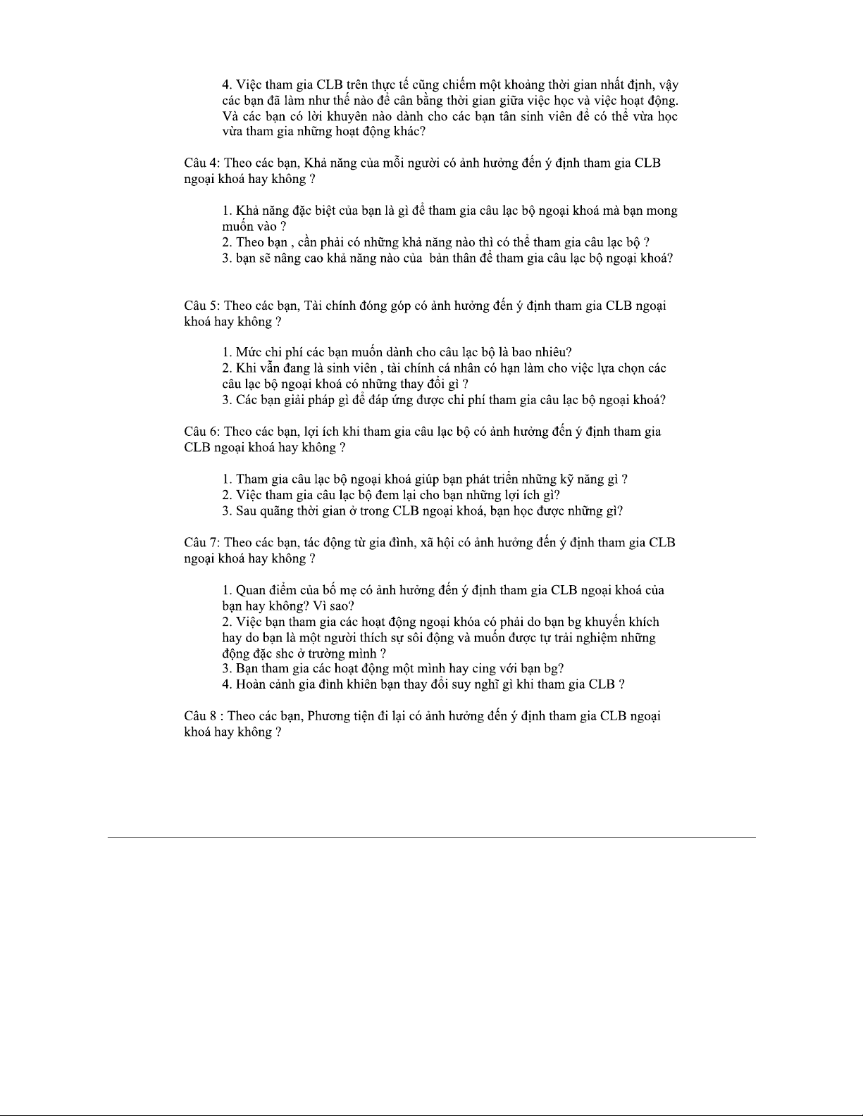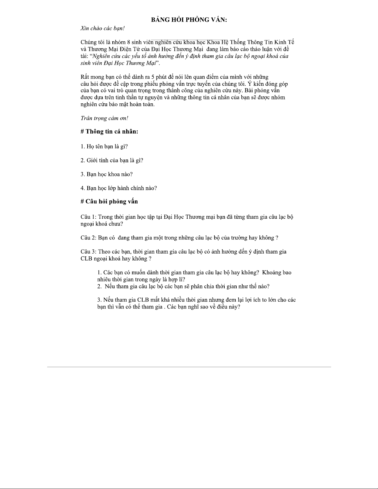 Bảng Hỏi Phỏng Vấn Nghiên Cứu Yếu Tố Tác Động CLB Ngoại Khóa