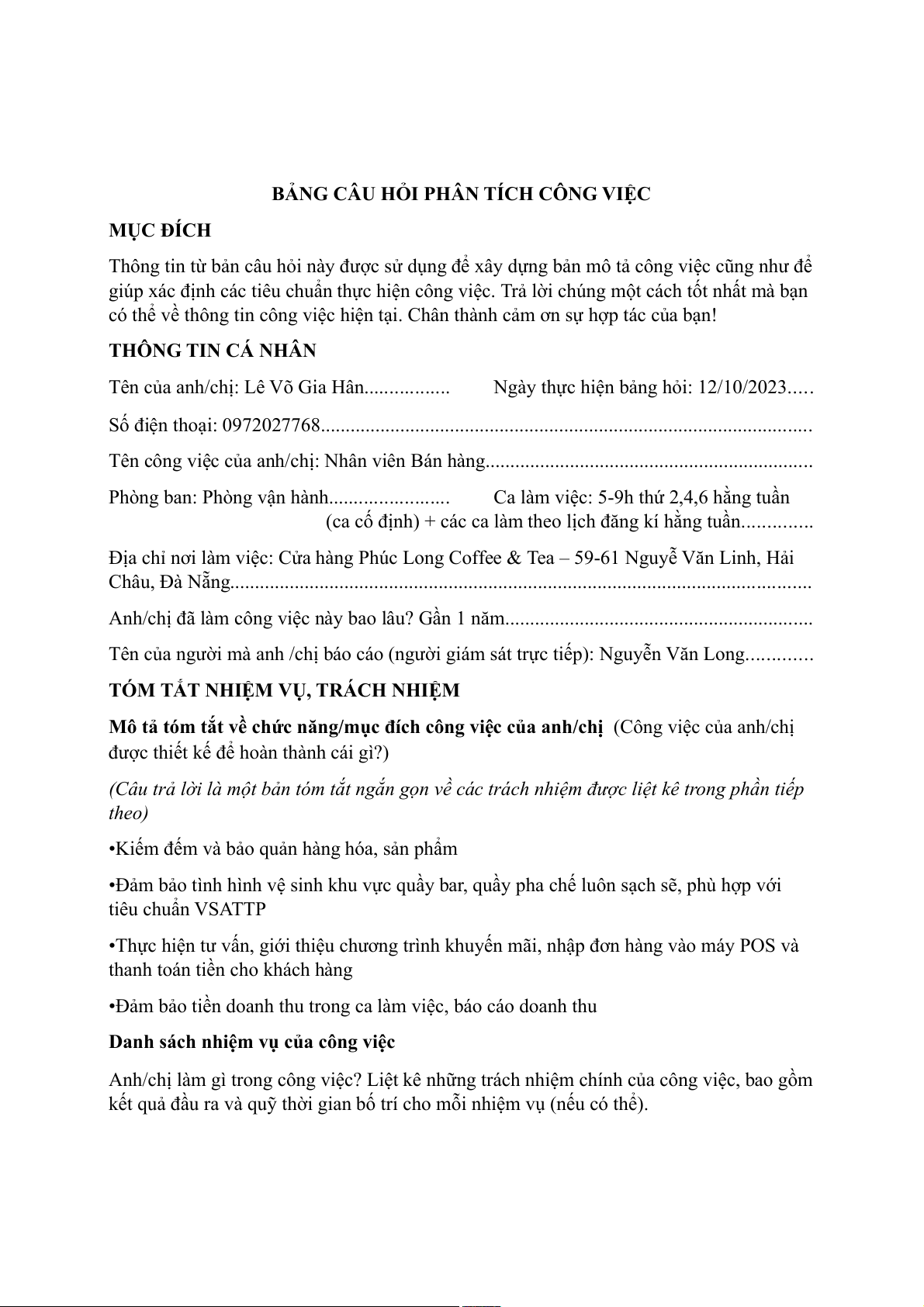 Địa chỉ nơi làm việc: Cửa hàng Phúc Long Coffee & Tea – 59-61 Nguyễ Văn Linh, Hải