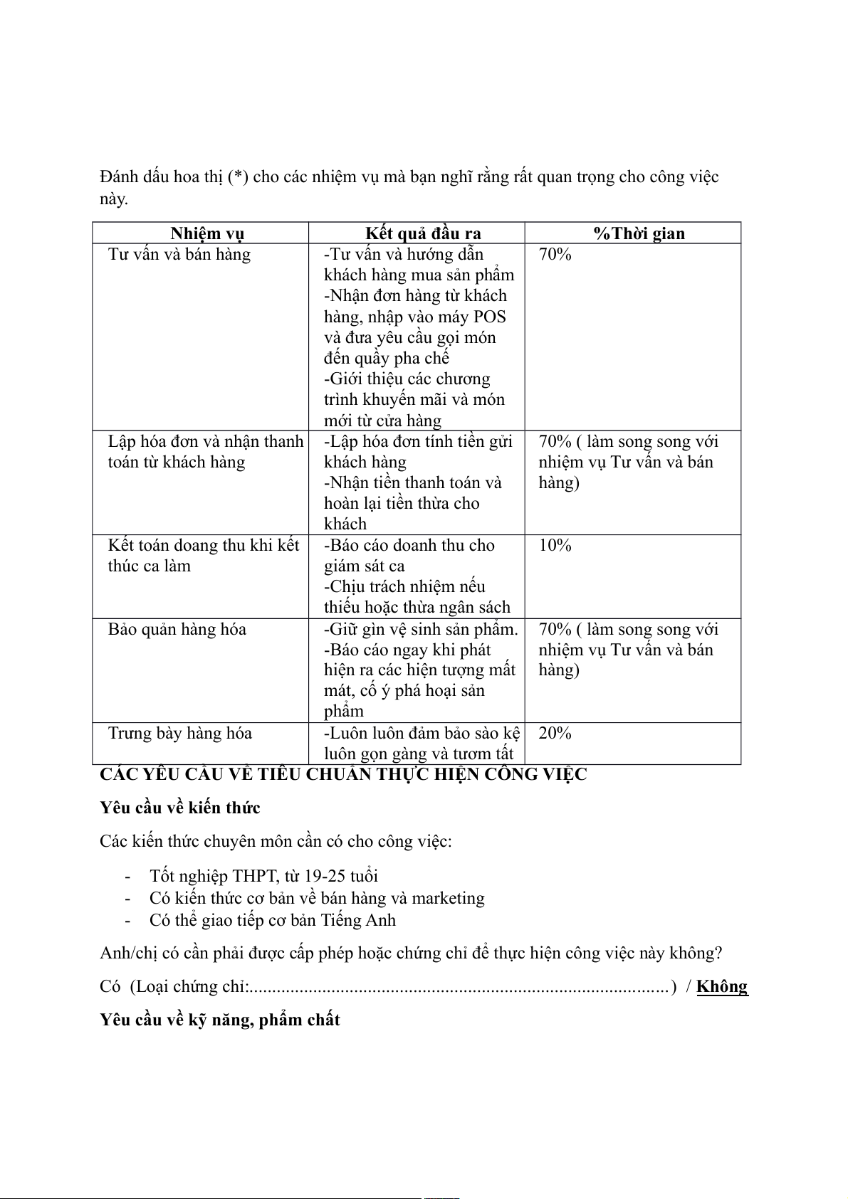 Đánh dấu hoa thị (*) cho các nhiệm vụ mà bạn nghĩ rằng rất quan trọng cho công việc này. Nhiệm vụ Kết quả đầu ra %Thời gian Tư vấn và bán hàng -Tư vấn và hướng dẫn 70% khách hàng mua sản phẩm
