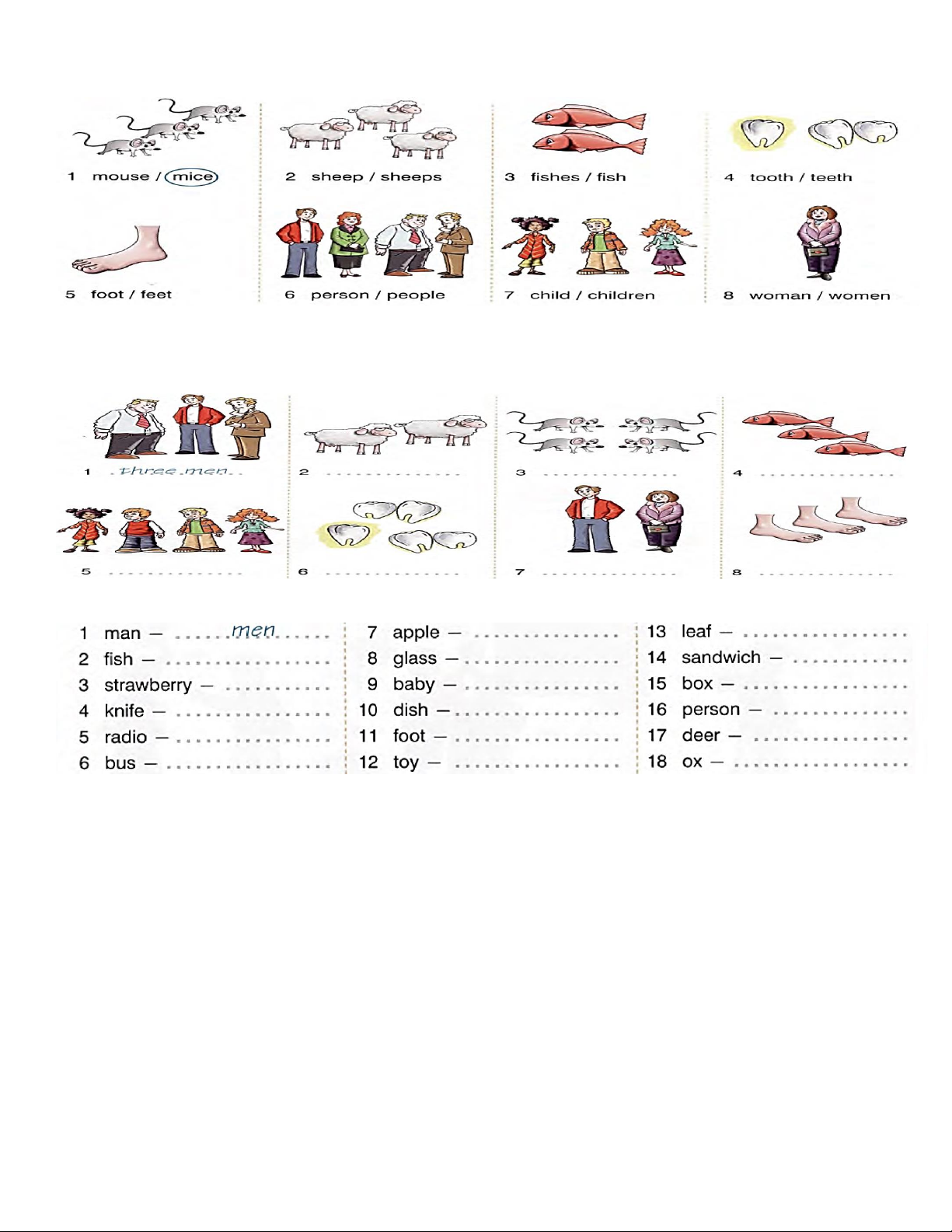 viết vào cột (2)…… bag boy tomato elephant knife leaf owl box cherry baby man butterfly mouse wolf glass foot watch child strawberry scarf -s (1) -es (2) -ies (3) -ves (4) Other (5) Trang 2 T Danhtừ Số nhiều Nghĩa TT Danhtừ Số nhiều Nghĩa T 1. Grandmother Bà 41. Heel Gót chân 2. grandfather Ông 42. Backs Lưng 3. father Bố 43. P erson 1 Người 4. mother Mẹ 44. Chest Ngực 5. sister Chị gái 45. e lbow/elbou/ Khủy tay 6. brother Anh trai 46. s ong Bài hát 7. Son Con trai 47. music Nhạc 8. daughter Con gái 48. homework Bài tập 9. child Đứa trẻ 49. key Chìa khóa 10. boy Cậu bé 50. bird Con chim 11. Girl Cô gái 51. boat Thuyền 12. man Đàn ông 52. book Sách 13. woman Đàn bà 53. car Ô tô 14. lady Quý bà 54. c oat Áo khoác 15. aunt Dì, cô 55. day Ngày 16. uncle Bác, chú 56. leaf Cái lá 17. cousin Em họ 57. fi sh Con cá 18. niece Cháu gái 58. fox Con cáo 19. baby Em bé 59. goose Con ngỗng 20. milk Sữa 60. puppy Chó nhỏ 21. tea Trà 61. pet Thú cưng 22. butter Bơ 62. nest Tổ chim 23. pie Bánh 63. s heep Cừu 24. Nose Mũi 64. mouce Chuột 25. Eye Mắt 65. deer Con nai 26. Mouth Mồm 66. calf Con bê 27. tongue Lưỡi 67. radio đài 28. Tooth Răng 68. piano /piˈænəʊ Đàn piano 29. Ear Tai 69. P hoto Bức ảnh 30. Head Đầu 70. video video 31. Hair tóc 71. t oy Đồ chơi 32. Cheek má 72. party Bữa tiệc 33. Forehead trán 73. s hip Tàu biển 34. Neck Cổ 74. pond Cái ao 35. Arm Tay 75. l ake Hồ 36. Leg Chân 76. road /rəʊd/ Đường 37. Shoulder Vai 77. s chool Trường 38. Hand Bàn tay 78. house Nhà 39. Toe tou/ Ngón 79. s tar Ngôi sao chân 40. Foot Bàn chân 80 city Thành phố Trang 3 Circle the correct answer Count and write foot person sheep child mouse fish man tooth