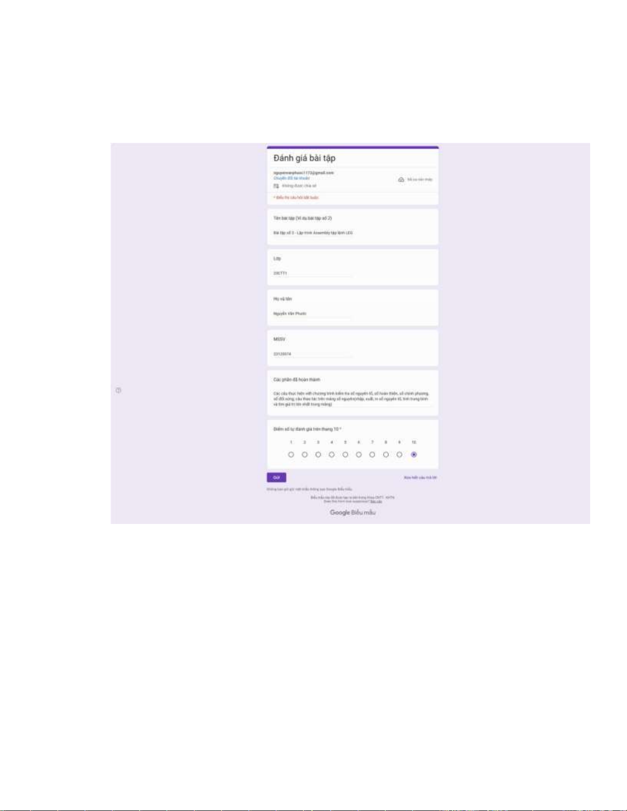 Điểm tự đánh giá: 10/10 Bài Đặc điểm Mức độ Ghi chú hoàn thành 1