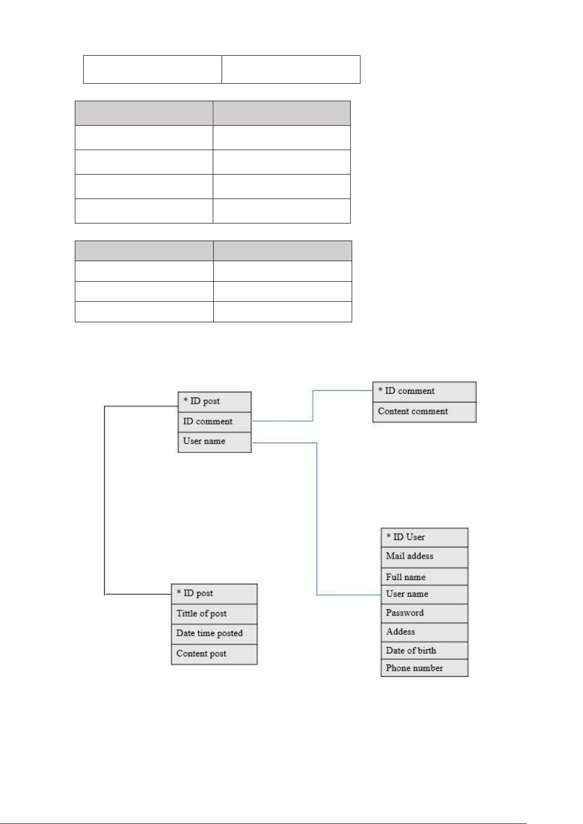 6. Kiểu dữ liệu của các thuộc tính Bảng 1: Tên trường Kiểu * ID user Int(10) Full name Varchar(45) Mail addess Varchar(45) Addess Varchar(45) User name Varchar(45) Password Varchar(45) Date of birth Datetime Phone number Int(11) Tên trường Kiểu * ID comment Int(11) Content comment Varchar(45) Bảng 2: Tên trường Kiểu * ID post Int(11) Tittle of post Varchar(45) Date time posted Datetime Content post Varchar(45) Bảng 3: Tên trường Kiểu * ID post Int(11) ID comment Int(11) User name Varchar(45) Bảng 4: