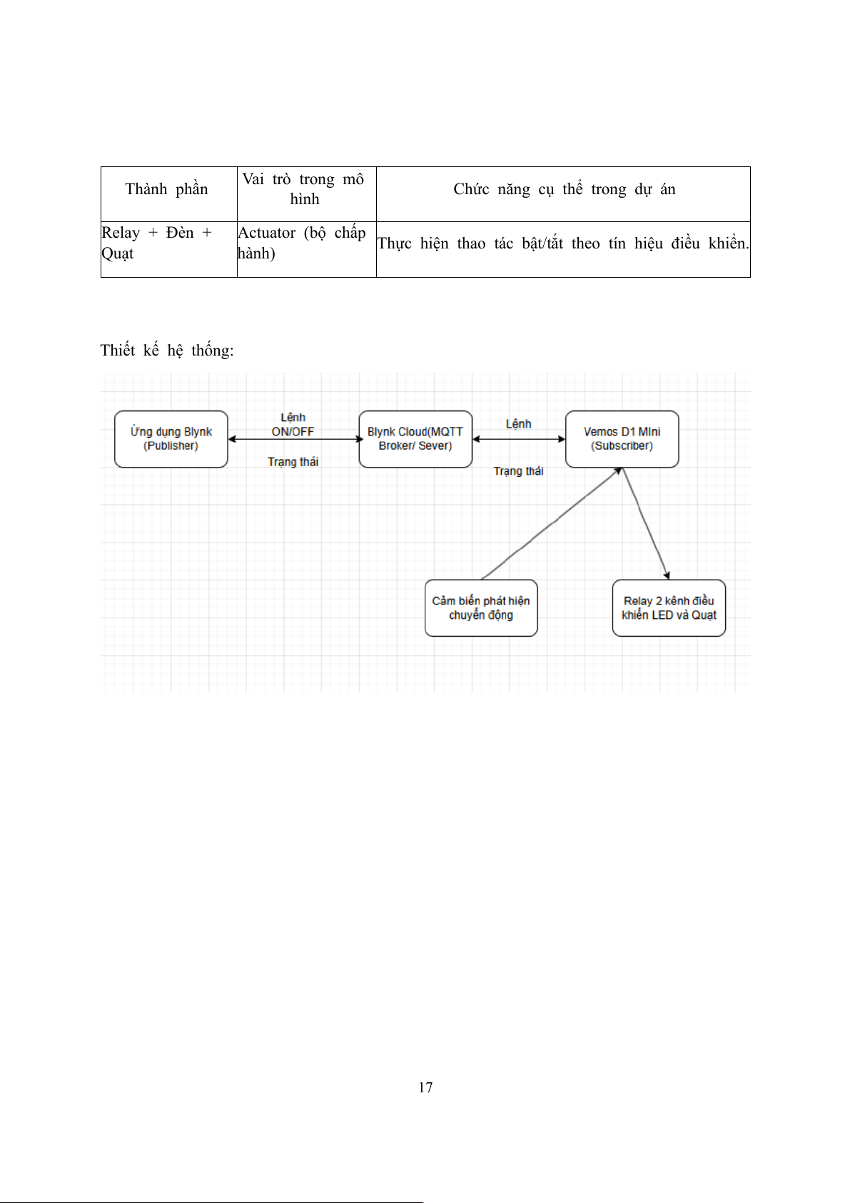 Relay + Đèn + Actuator (bộ chấp Thực hiện thao tác bật/tắt theo tín hiệu điều khiển. Quạt hành) Thiết kế hệ thống: 17