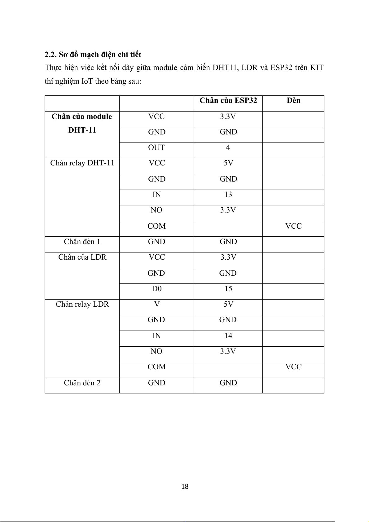 thí nghiệm IoT theo bảng sau: Chân của ESP32 Đèn Chân của module VCC 3.3V DHT-11 GND GND OUT 4 Chân relay DHT-11 VCC 5V GND GND IN 13 NO 3.3V COM VCC Chân đèn 1 GND GND Chân của LDR VCC 3.3V GND GND D0 15 Chân relay LDR V 5V GND GND IN 14 NO 3.3V COM VCC Chân đèn 2 GND GND 18