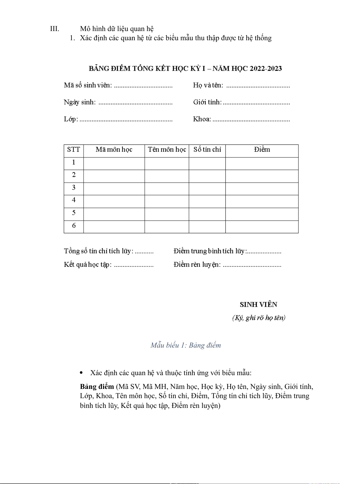Xác định các quan hệ và thuộc tính ứng với biểu mẫu: