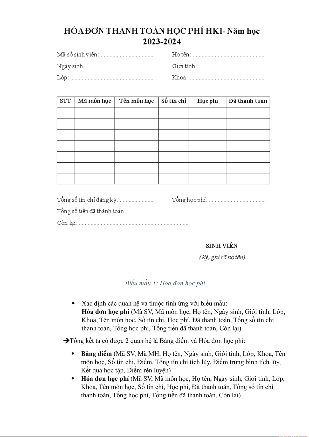 - Hóa đơn học phí (Mã hóa đơn, Mã SV, Họ tên, Ngày sinh, Giới tính,