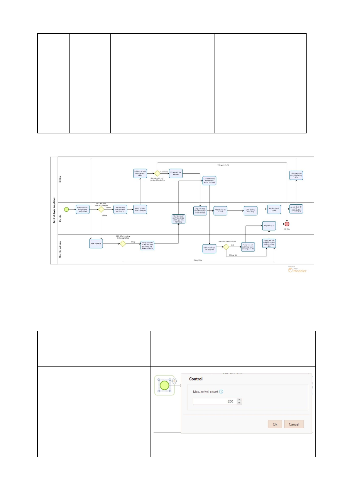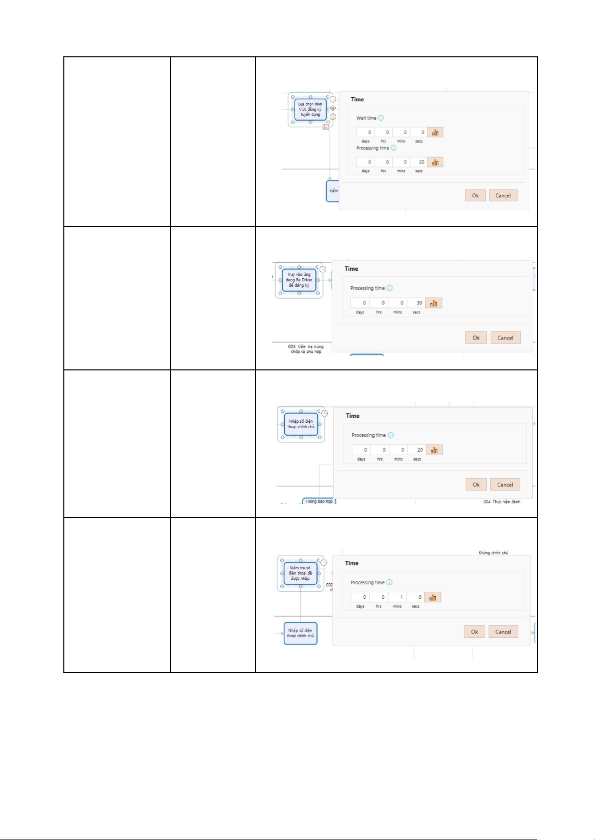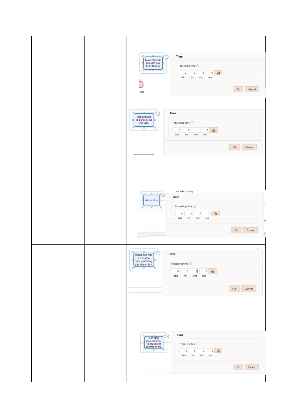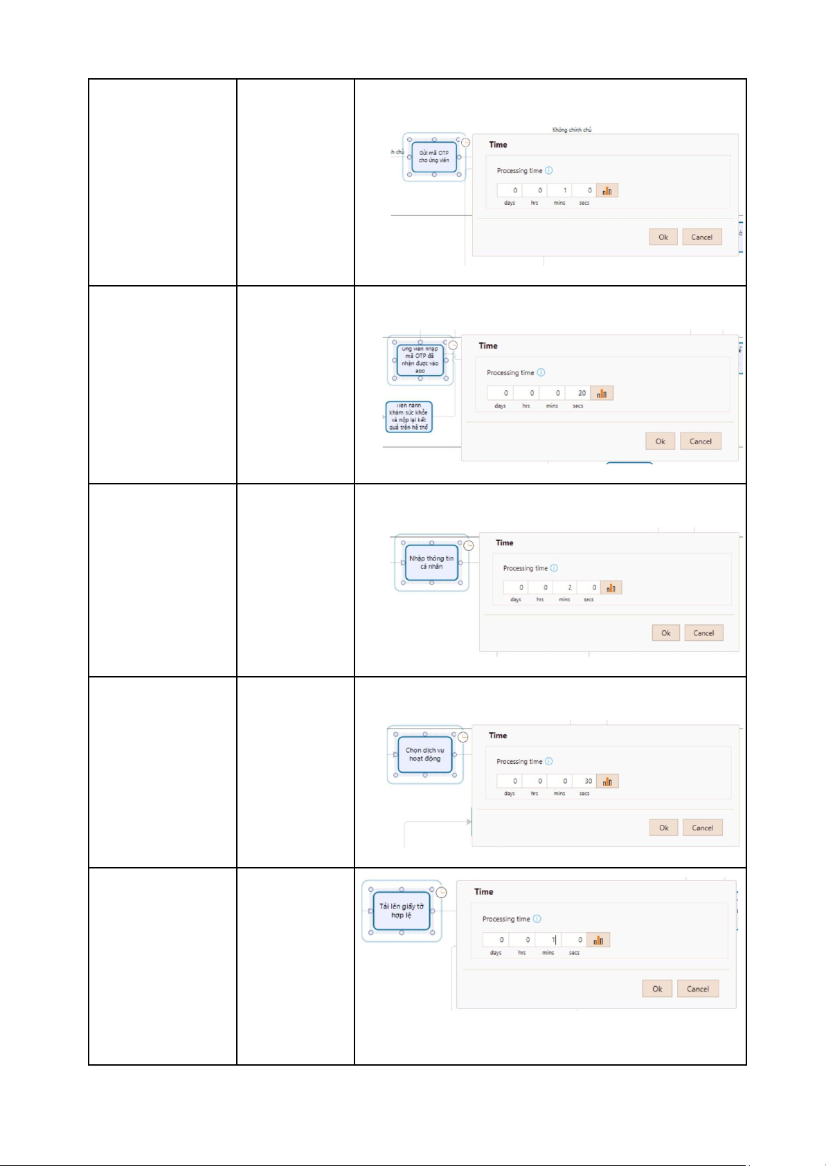 Hình ảnh cài tham số Task 1: Lựa chọn 20 giây hình thức đăng ký tuyển dụng Task 2: Truy cập 30 giây vào ứng dụng để đăng ký Task 3: Nhập số 20 giây điện thoại chính chủ Task 4: Kiểm tra 1 phút SĐT đã được nhập Task 5: Hệ thống 1 phút gửi mã OTP Cho ứng viên Task 6: Ứng viên 20 giây nhập mã OTP Task 7: Ứng viên 2 phút nhập thông tin cá nhân Task 8: Chọn dịch 30 giây vụ hoạt động Task 9: Tải lên 1 phút giấy tờ hợp lệ Task 10: Nhấn gửi 10 giây Task 11: Hệ thống 1 phút tiếp nhận hồ sơ đăng ký của ứng viên Task 12: Nhân viên 5 phút tuyển dụng tiếp nhận hồ sơ đăng ký Task 13: Thông báo 1 phút hồ sơ hợp lệ và gửi thông báo khám sức khỏe Task 14: Khám 5 giờ sức khỏe