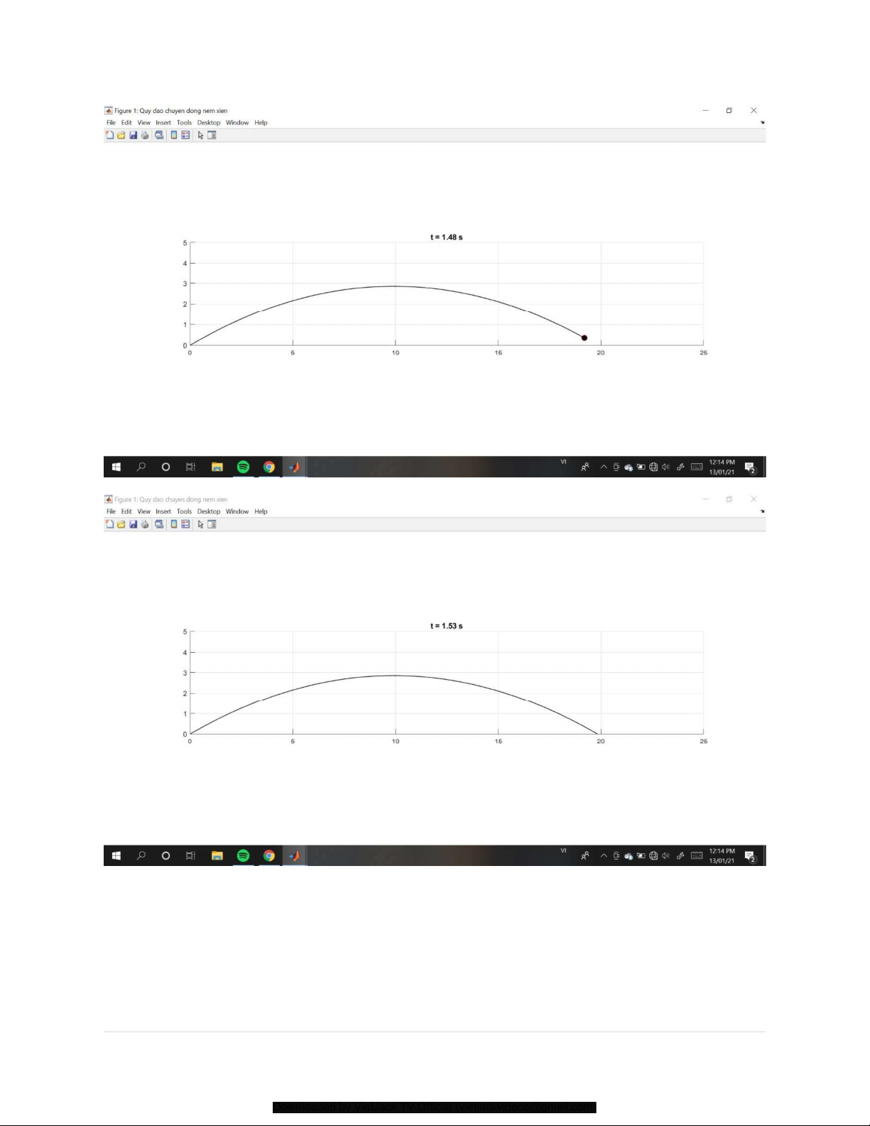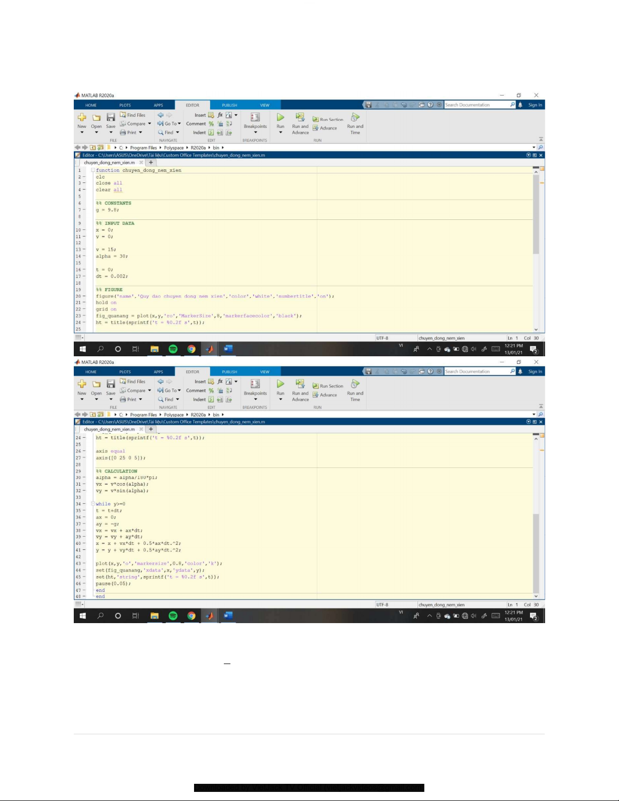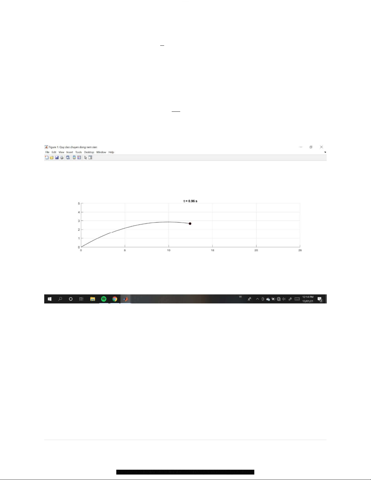 Downloaded by VietJack TV Official (vietjackvideos@gmail.com) alpha = alpha/180*pi; vx = v*cos(alpha); vy = v*sin(alpha); while y>=0 t = t+dt; ax = 0; ay = -g; vx = vx + ax*dt; vy = vy + ay*dt; x = x + vx*dt + 0.5*ax*dt.^2; y = y + vy*dt + 0.5*ay*dt.^2;