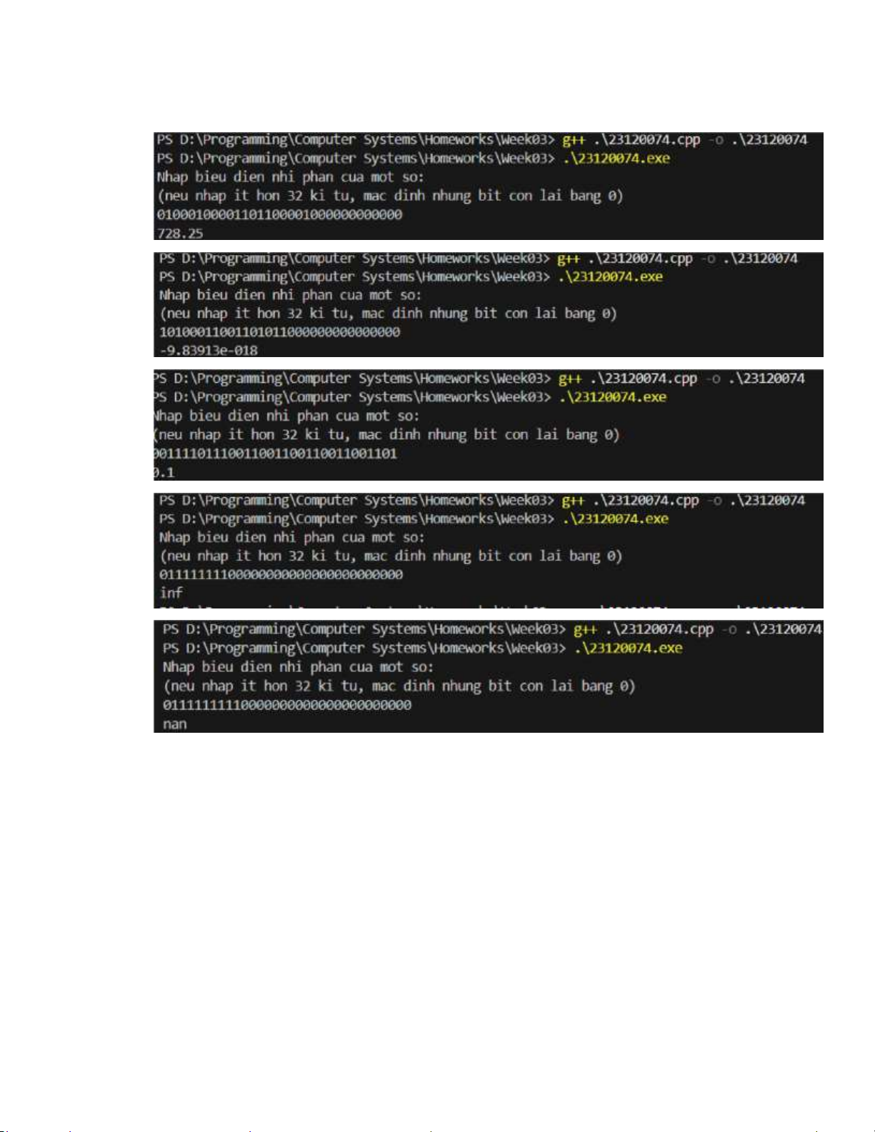 Hàm này có ý tưởng giống với hàm dumpFloat nhưng có cơ chế hoạt động ngược lại int inputBinary(char *&s) { s = new char[33] ; memset(s, '0', 33) ; 3 lOMoAR cPSD| 59994889 fgets(s, 33, stdin) ; int len = strlen(s) ; if (s[len - 1] == '\n') s[len - 1] = '\0';