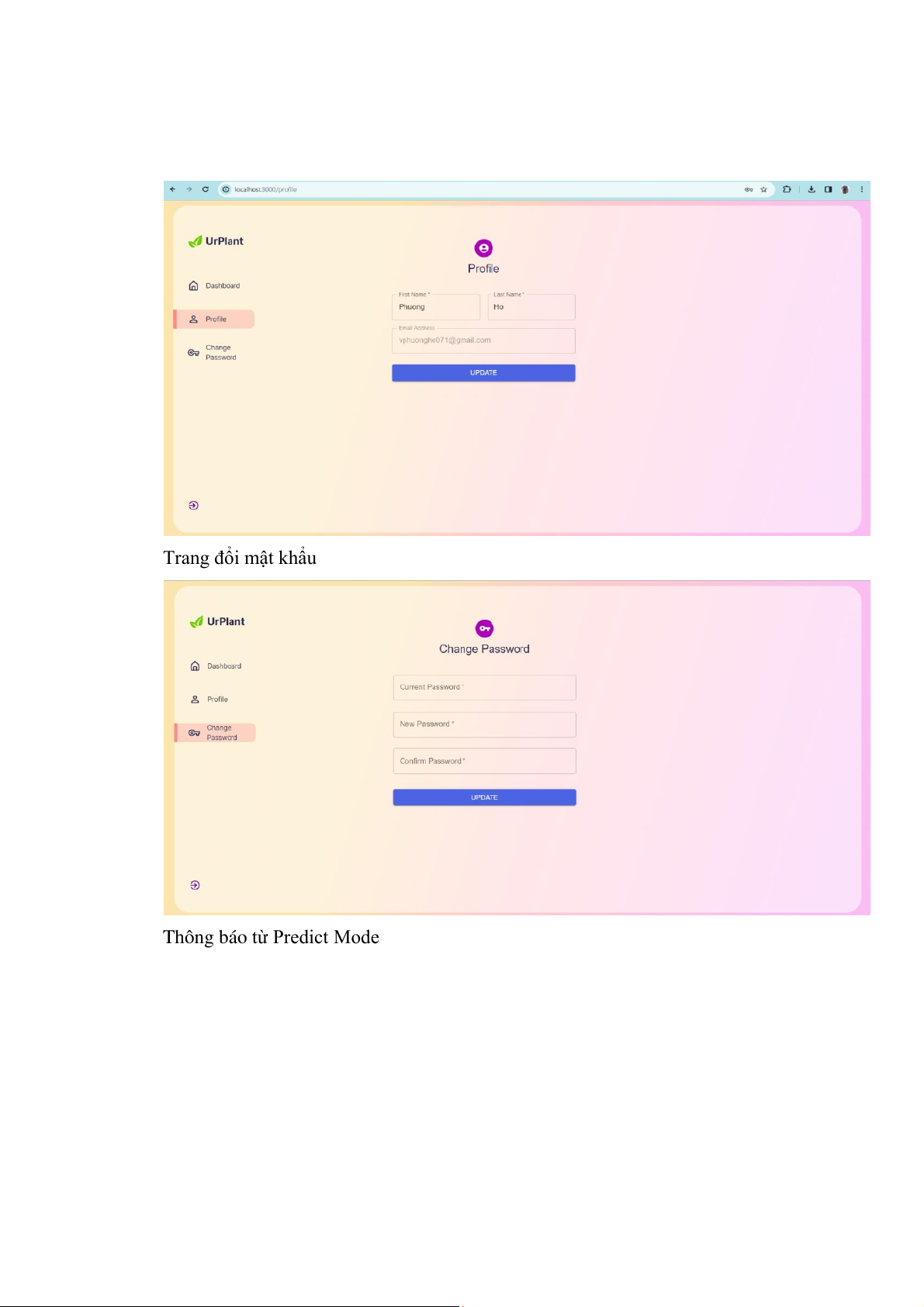 Bước 10: Phát triển ứng dụng ● Giao diện web Đăng nhập Giao diện chính Thông tin người dùng Trang đổi mật khẩu Thông báo từ Predict Mode