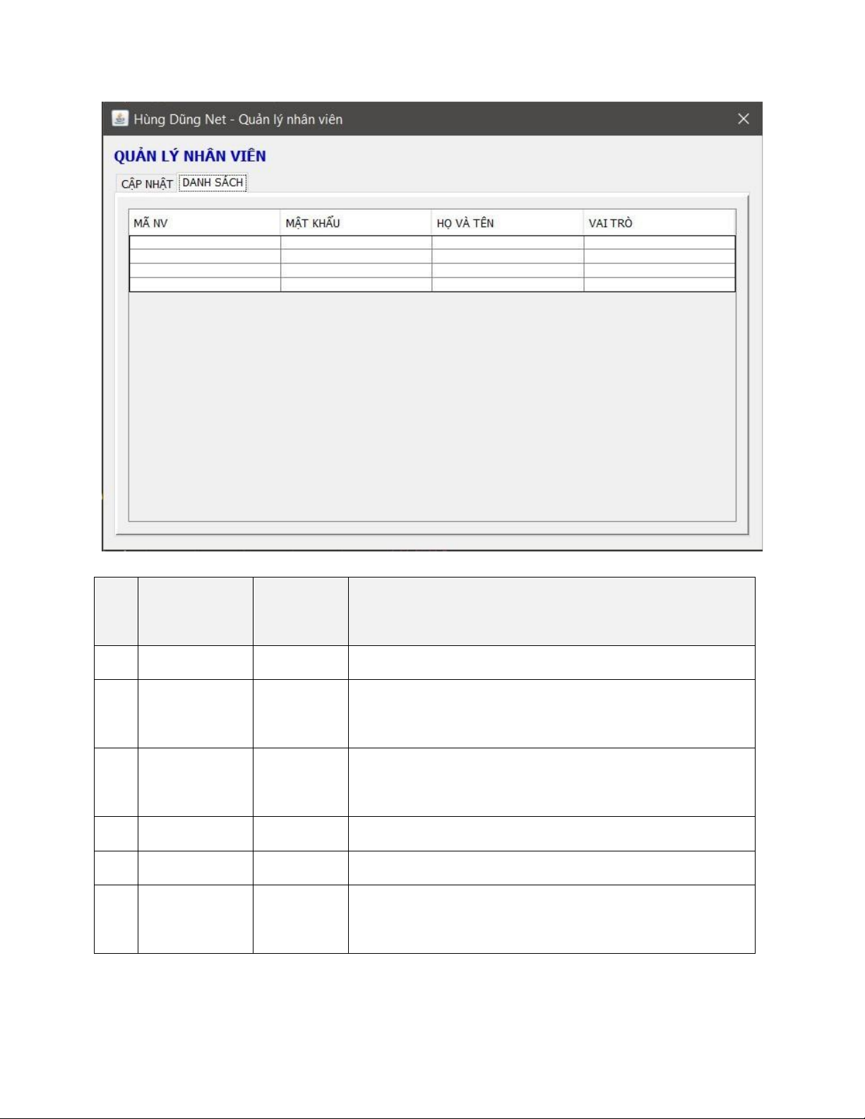 THUỘC TÍNH KIỂU DỮ MÔ TẢ LIỆU MaNV varchar(20) Mã nhân viên Mật khẩu varchar(20) Mật khẩu Họ Tên nvarchar(50) Tên nhân viên Vai trò bit