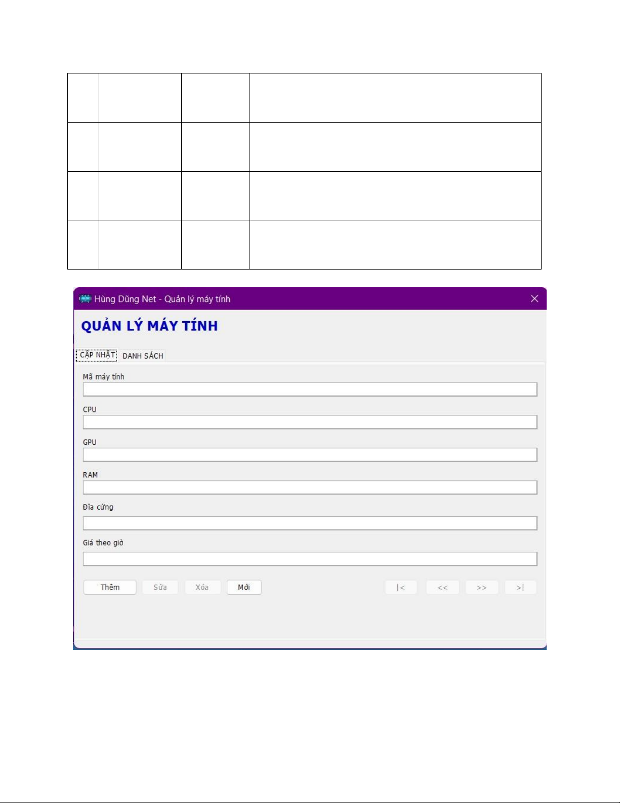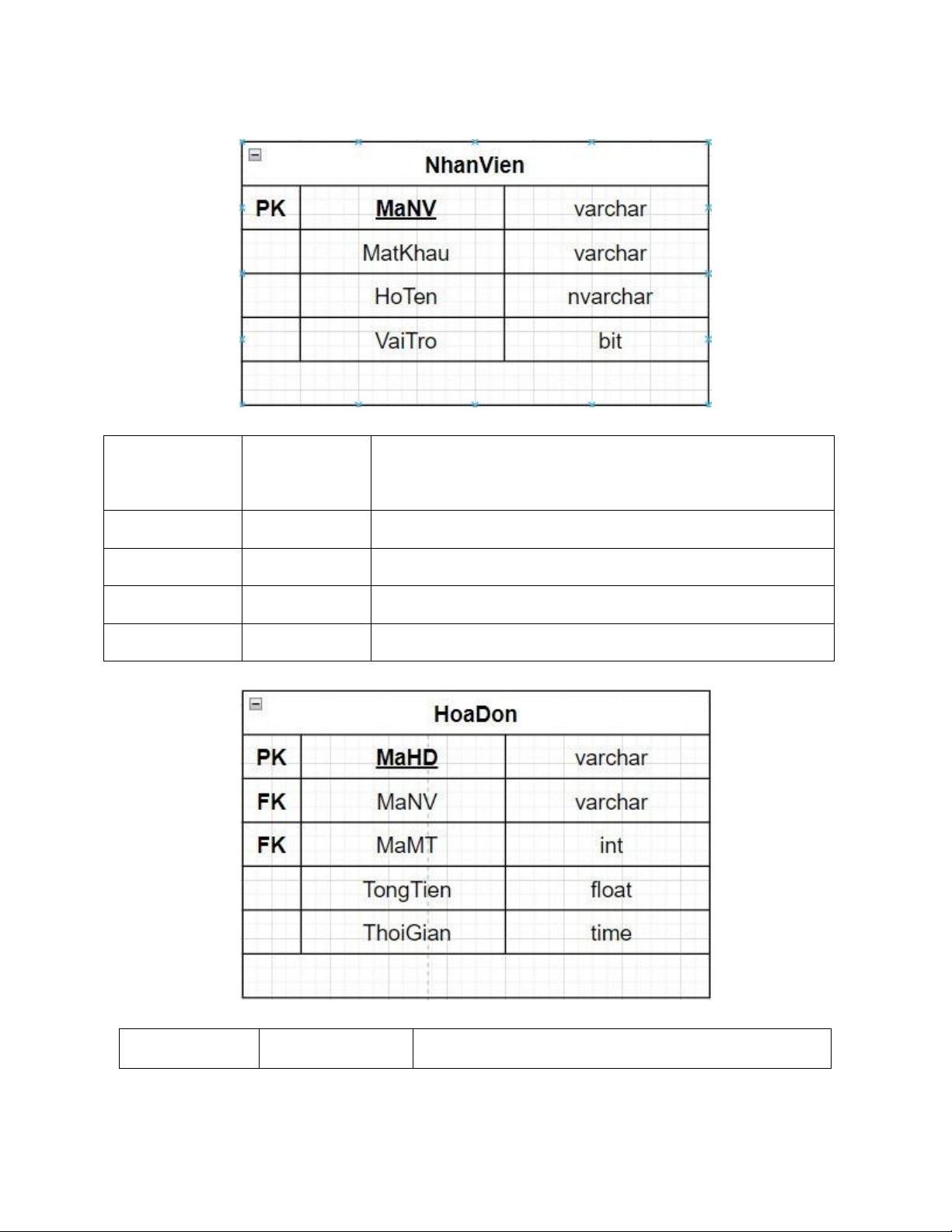 THUỘC TÍNH KIỂU DỮ LIỆU MÔ TẢ MaHD varchar(10) Mã hóa đơn MaNV varchar(20) Mã nhân viên MaMT int Mã máy tính TongTien float Tổng tiền ThoiGian time Thời gian tạo hóa đơn