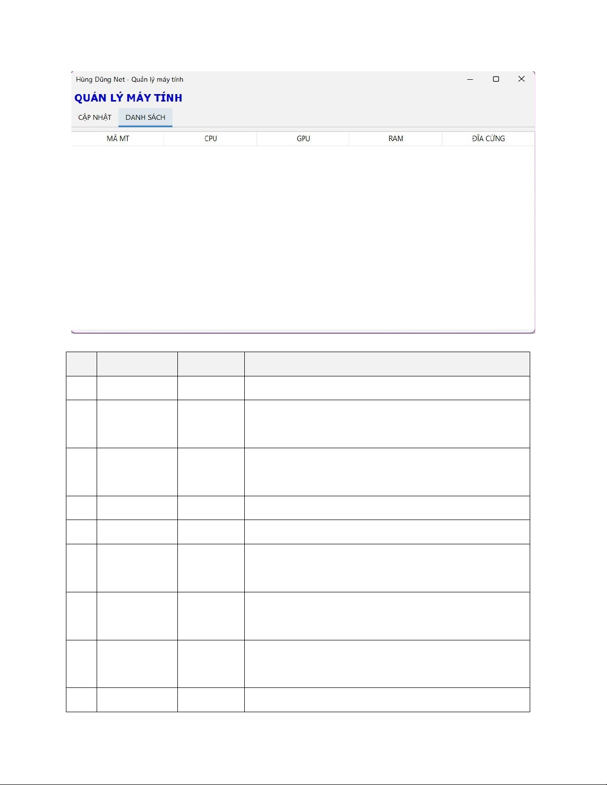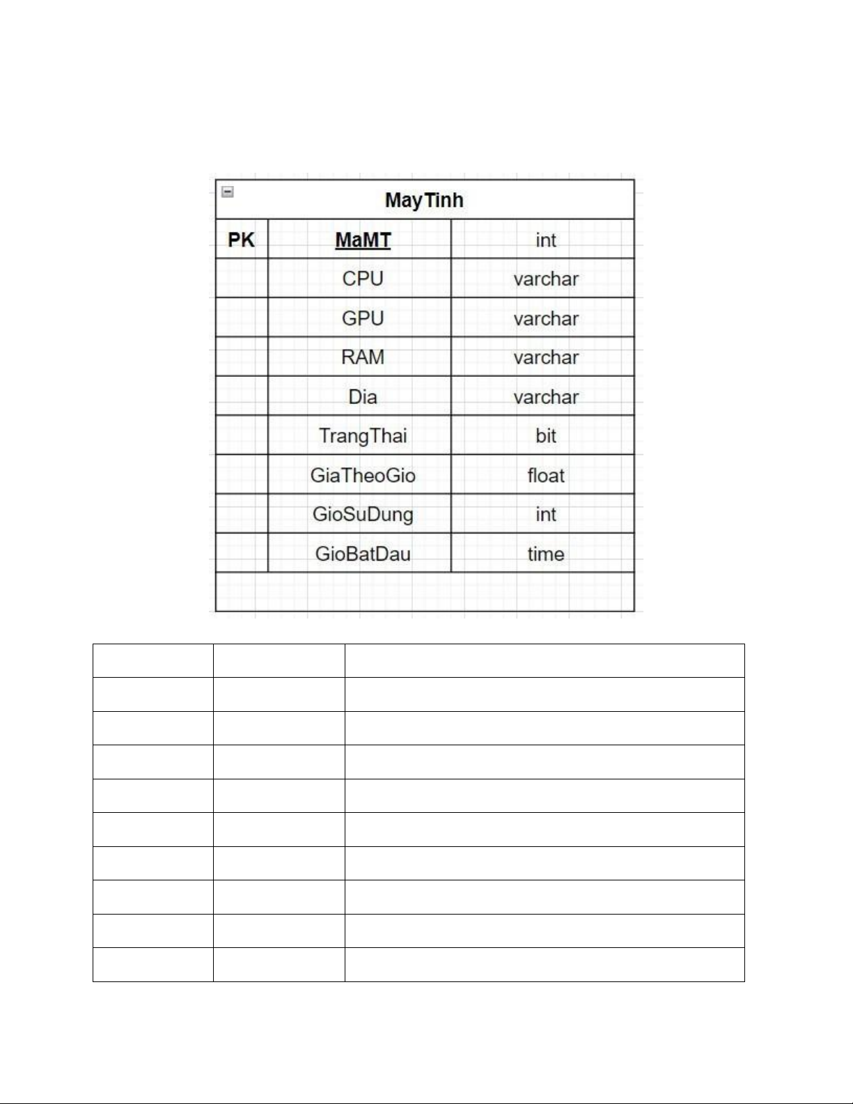 THUỘC TÍNH KIỂU DỮ LIỆU MÔ TẢ MaMT int Mã máy tính CPU varchar(30) Bộ xử lí trung tâm GPU varchar(30)