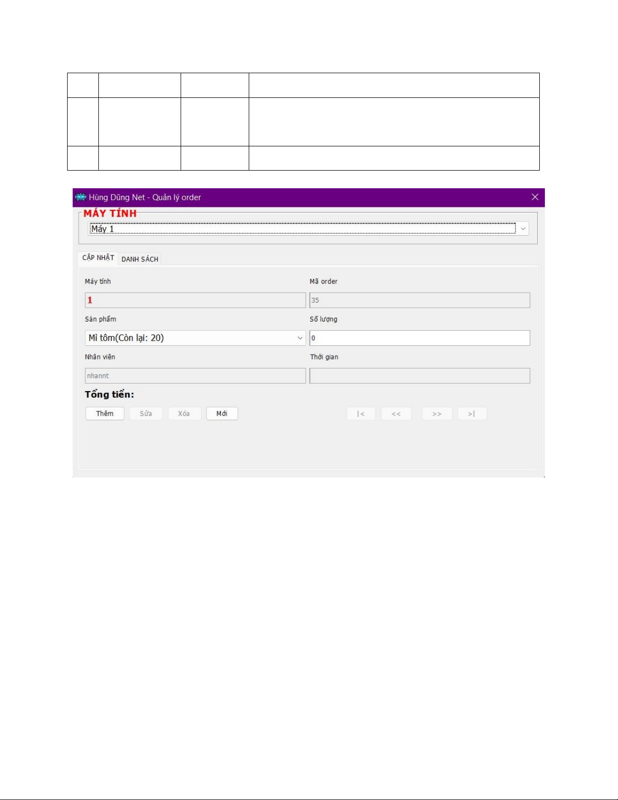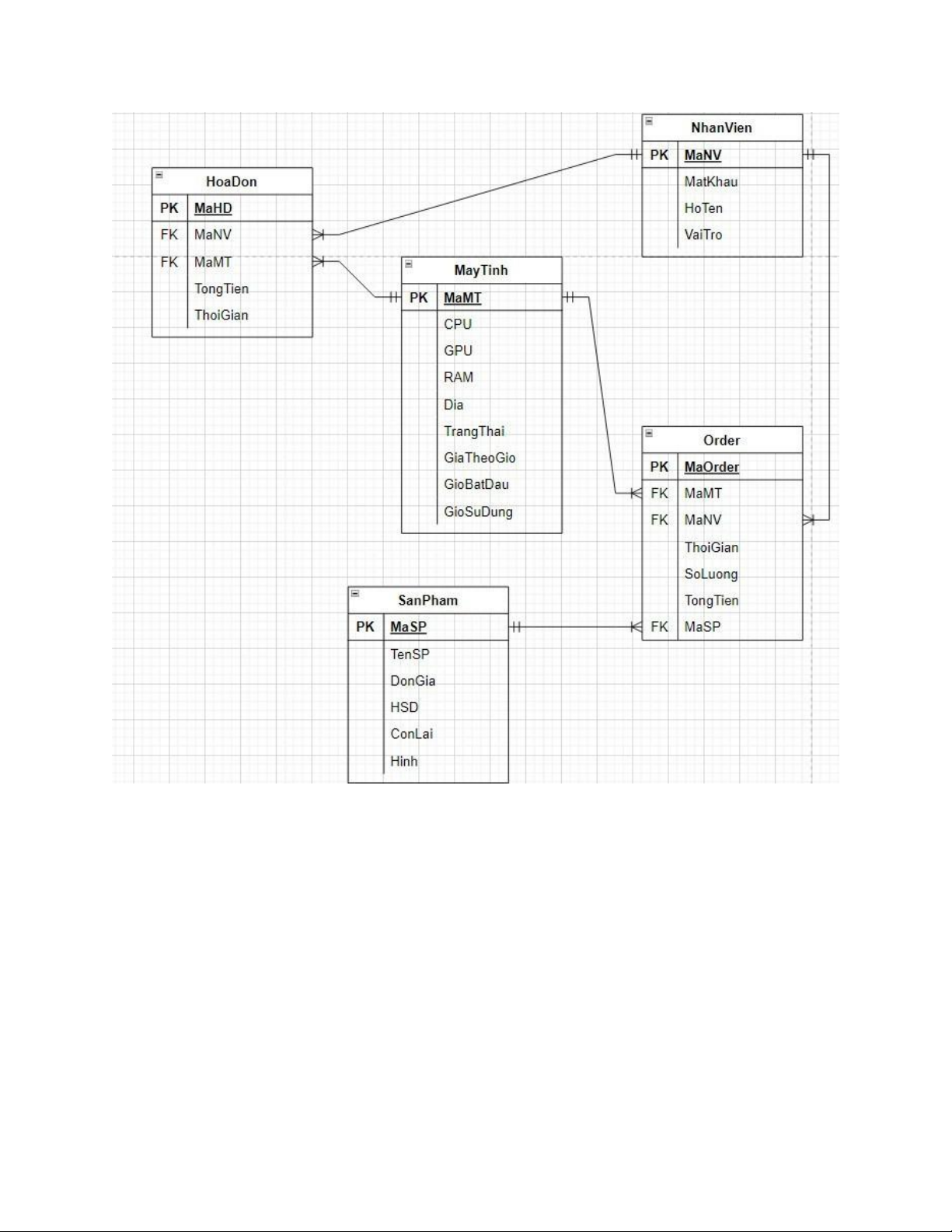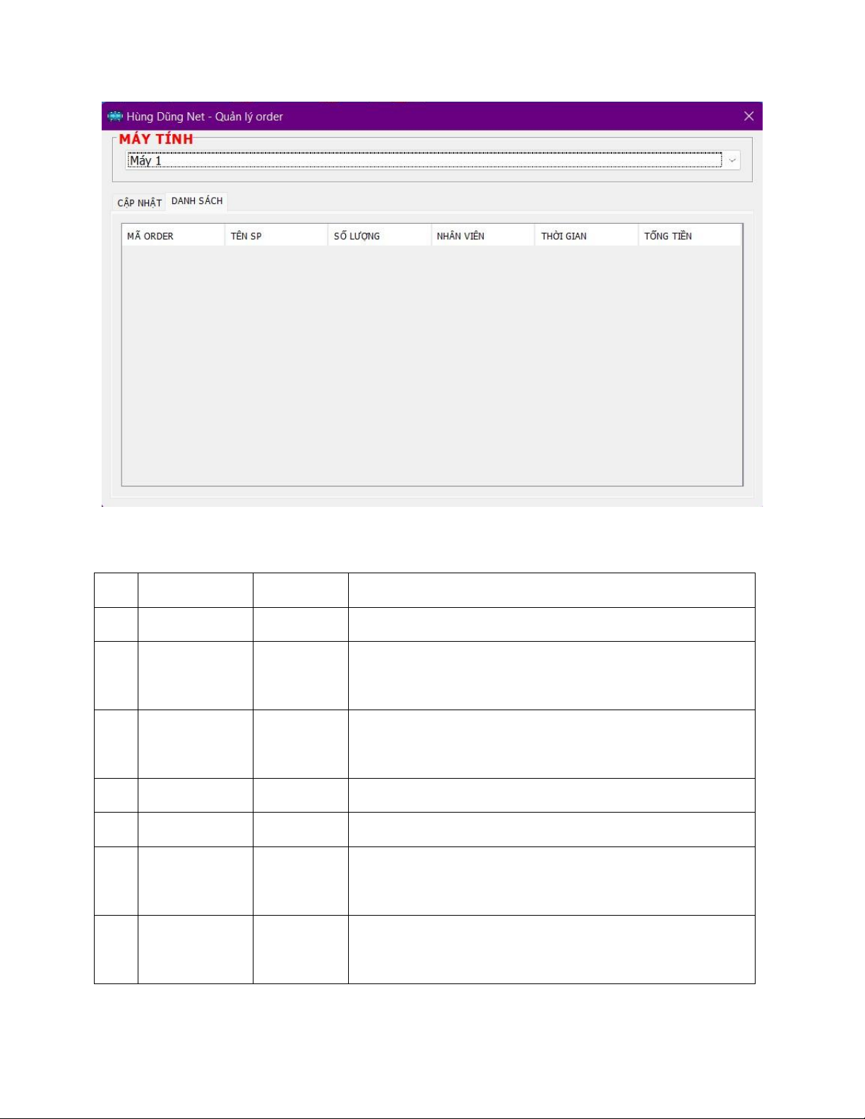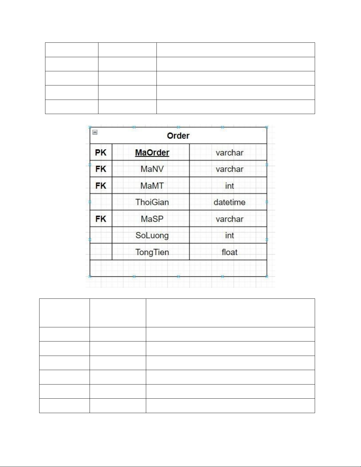 KIỂU DỮ LIỆU MÔ TẢ TÍNH MaOrder int Mã order MaNV varchar(20) Mã nhân viên MaMT int Mã máy tính ThoiGian datetime Thời gian nhận order MaSP varchar Mã sản phẩm SoLuong int