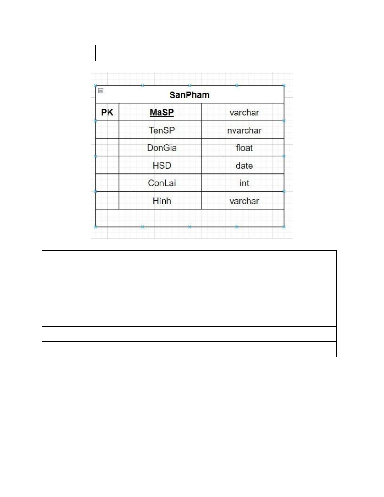 KIỂU DỮ LIỆU MÔ TẢ MaSP varchar(10) Mã sản phẩm TenSP nvarchar(20) Tên sản phẩm DonGia float Đơn giá HSD date Hạn sử dụng ConLai int