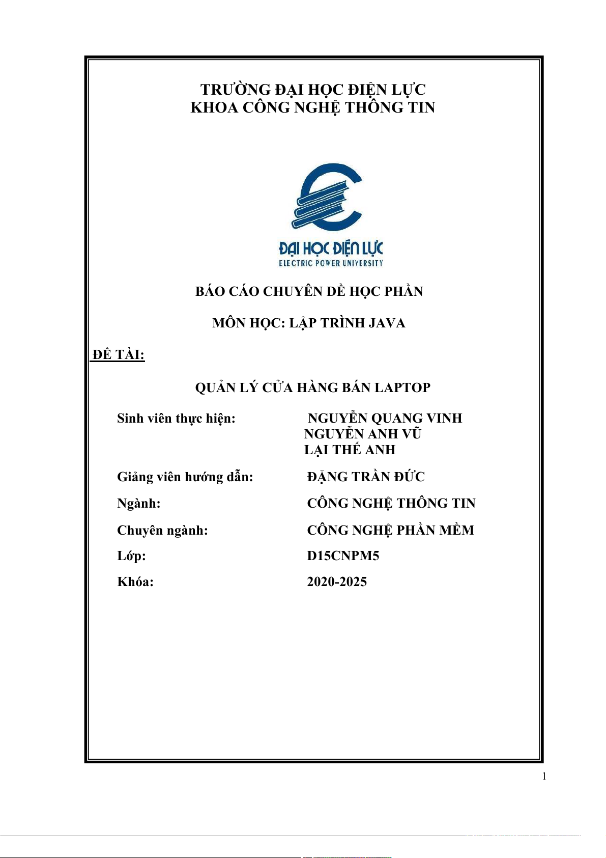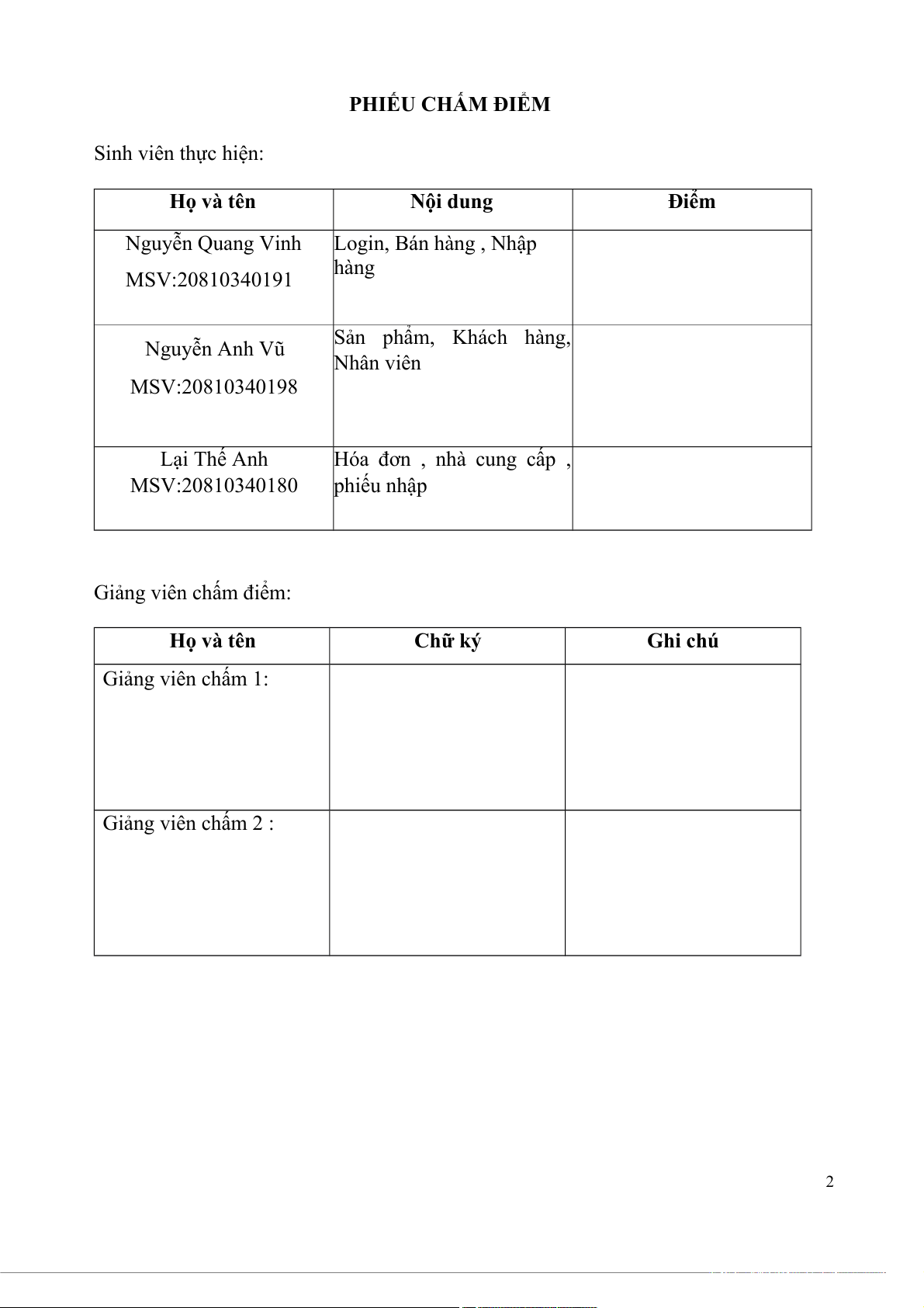 CÔNG NGHỆ PHẦN MỀM Lớp: D15CNPM5 Khóa: 2020-2025 1 PHIẾU CHẤM ĐIỂM Sinh viên thực hiện: Họ và tên Nội dung Điểm Nguyễn Quang Vinh Login, Bán hàng , Nhập hàng MSV:20810340191 Sản phẩm, Khách hàng, Nguyễn Anh Vũ Nhân viên MSV:20810340198 Lại Thế Anh Hóa đơn , nhà cung cấp , MSV:20810340180 phiếu nhập Giảng viên chấm điểm: Họ và tên Chữ ký Ghi chú Giảng viên chấm 1: Giảng viên chấm 2 : 2 MỤC LỤC