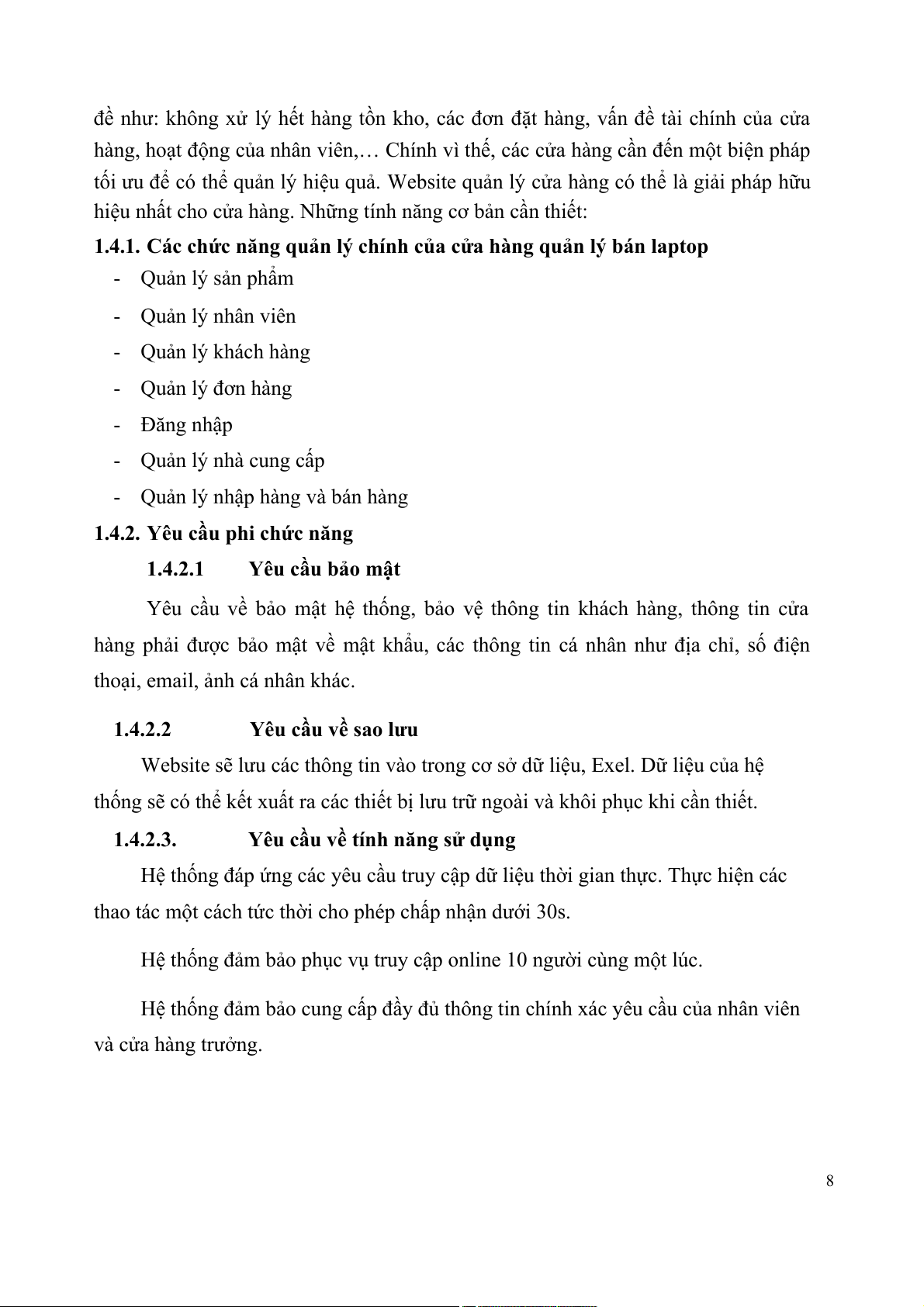 1.4.1 .Các chức năng quản lý chính của cửa hàng quản lý bán laptop - Quản lý sản phẩm - Quản lý nhân viên - Quản lý khách hàng - Quản lý đơn hàng - Đăng nhập - Quản lý nhà cung cấp