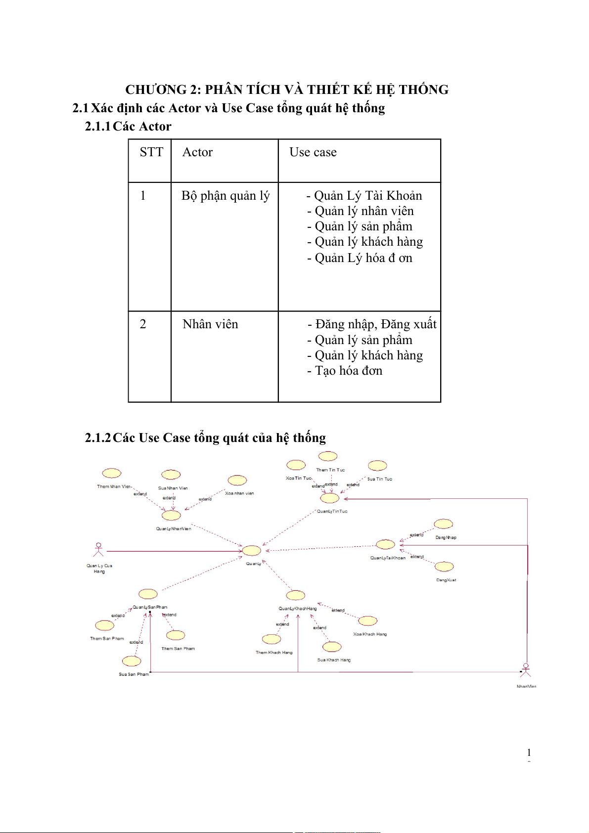 2.1 Xác định các Actor và Use Case tổng quát hệ thống 2.1.1Các Actor STT Actor Use case 1 Bộ phận quản lý - Quản Lý Tài Khoản - Quản lý nhân viên - Quản lý sản phẩm - Quản lý khách hàng - Quản Lý hóa đ ơn 2 Nhân viên - Đăng nhập, Đăng xuất - Quản lý sản phẩm - Quản lý khách hàng - Tạo hóa đơn