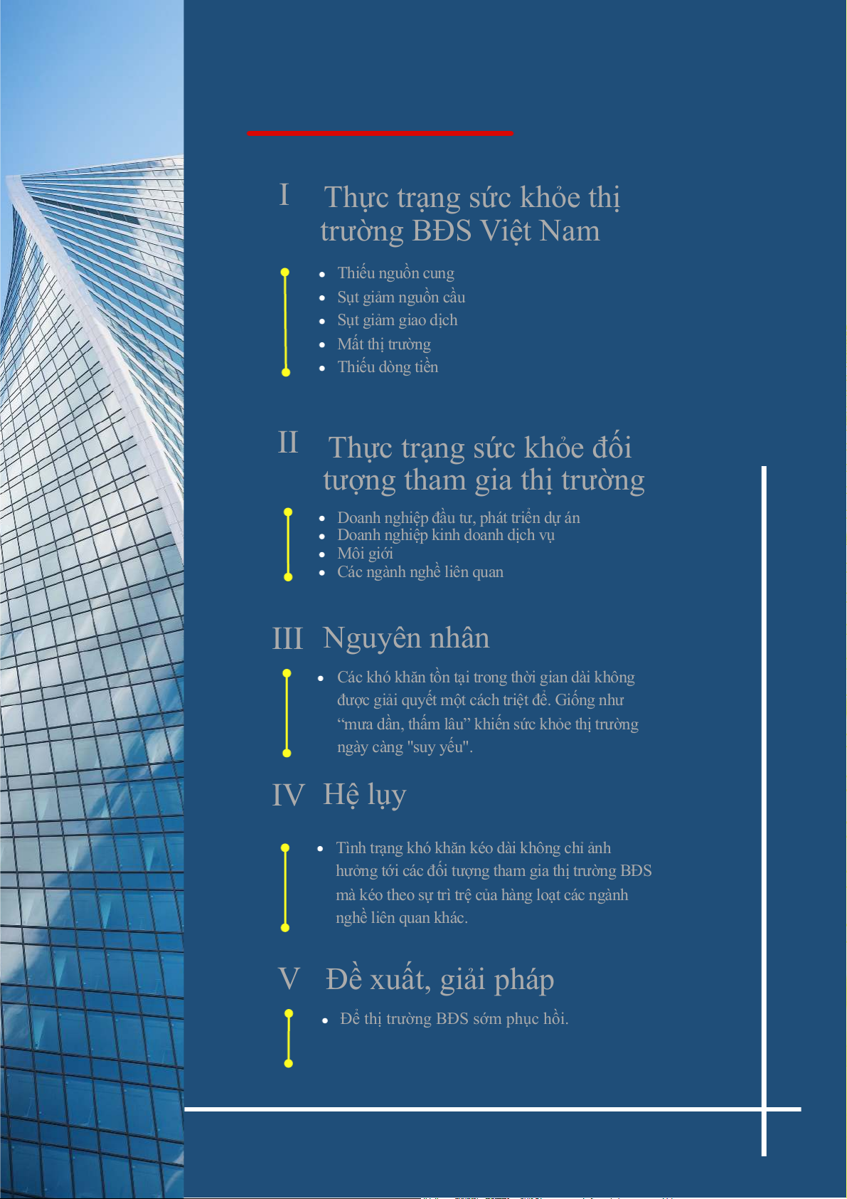 I Thực trạng sức khỏe thị trường BĐS Việt Nam Thiếu nguồn cung Sụt giảm nguồn cầu Sụt giảm giao dịch Mất thị trường Thiếu dòng tiền II NỘI DUNG