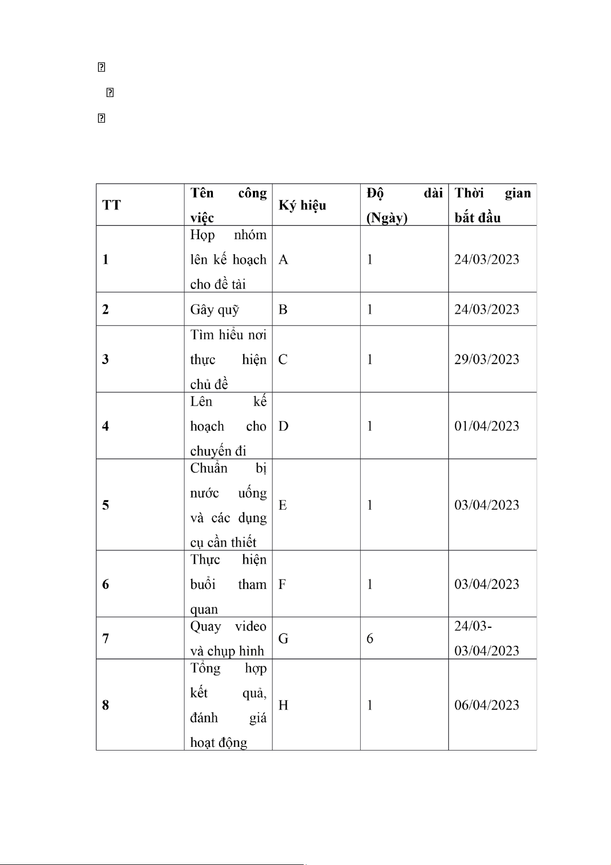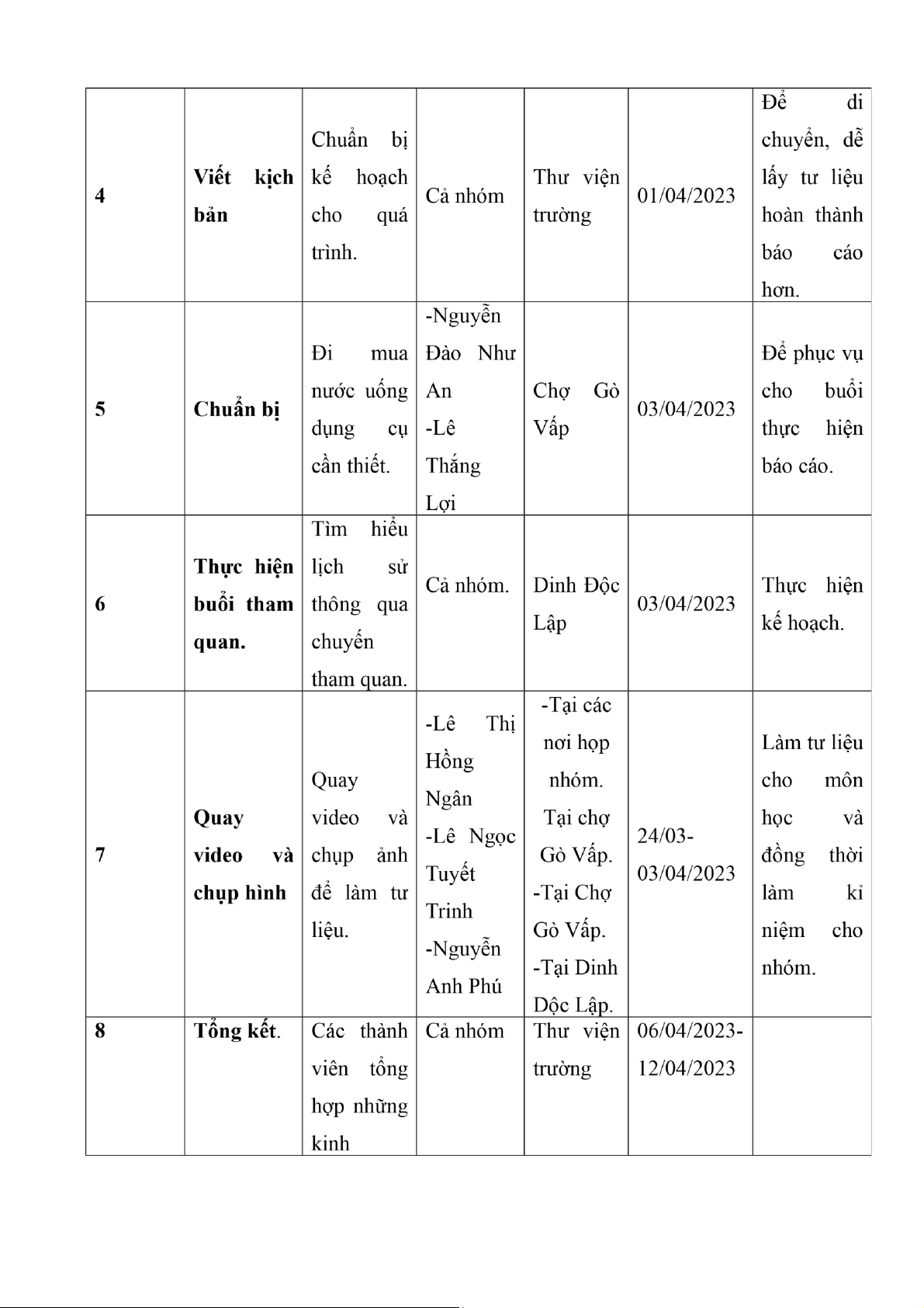 nhiệm vụ thực hiện hiện Cả nhóm Nhà đóng góp Xây dựng Họp nhóm Thiếu nhi 1 ý kiến, Cả nhóm 24/03/2023 kế hoạch, Quận Gò trao đổi kế phân công Vấp hoạch nhiệm vụ Mỗi thành Gây quỹ viên trong Nhà mua nước nhóm Thiếu nhi và dụng cụ 2 Gây quỹ đóng Cả nhóm 24/03/2023 Quận Gò cần thiết 70.00 đ 0 Vấp phục vụ vào quỹ cho nhóm. nhóm Xem và Để tìm Tìm hiểu tham khảo hiểu thông nơi thực trước các Dinh Độc tin, cũng 3 Cả nhóm 29/03/2023 hiện chủ di tích lịch Lập như tham đề sử ở Dinh khảo phí Độc Lập tham quan nghiệm đánh giá hoạt động, tổng hợp.