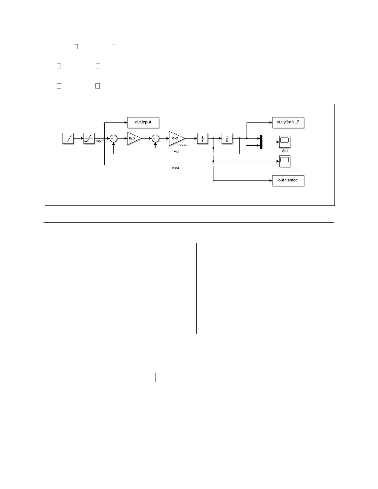 Sơ đồ khối mô phỏng trên matlab simulink Code: cp2=0.24; cv2=0.96; hold on KL=58; plot(out.input.Time, NL=4; out.input.Data, '--k' , Jm=0.0085; 'LineWidth' ,1) Ng=1; plot(out.y2st.Time, out.y2st.Data, '-r' , JL = NL*Jm*(Ng^2); 'LineWidth' ,1) wL = sqrt(KL/JL); legend( 'Input' , 'Vitri' ) Kp2=cp2*wL; %plot(out.vantoc.Time, Kv2=cv2*wL; out.vantoc.Data, '-r', sim( 'Bac2_NL4' ) 'LineWidth',1) %ve do thi matlab grid on lOMoARcPSD| 37054152 lOMoARcPSD| 37054152