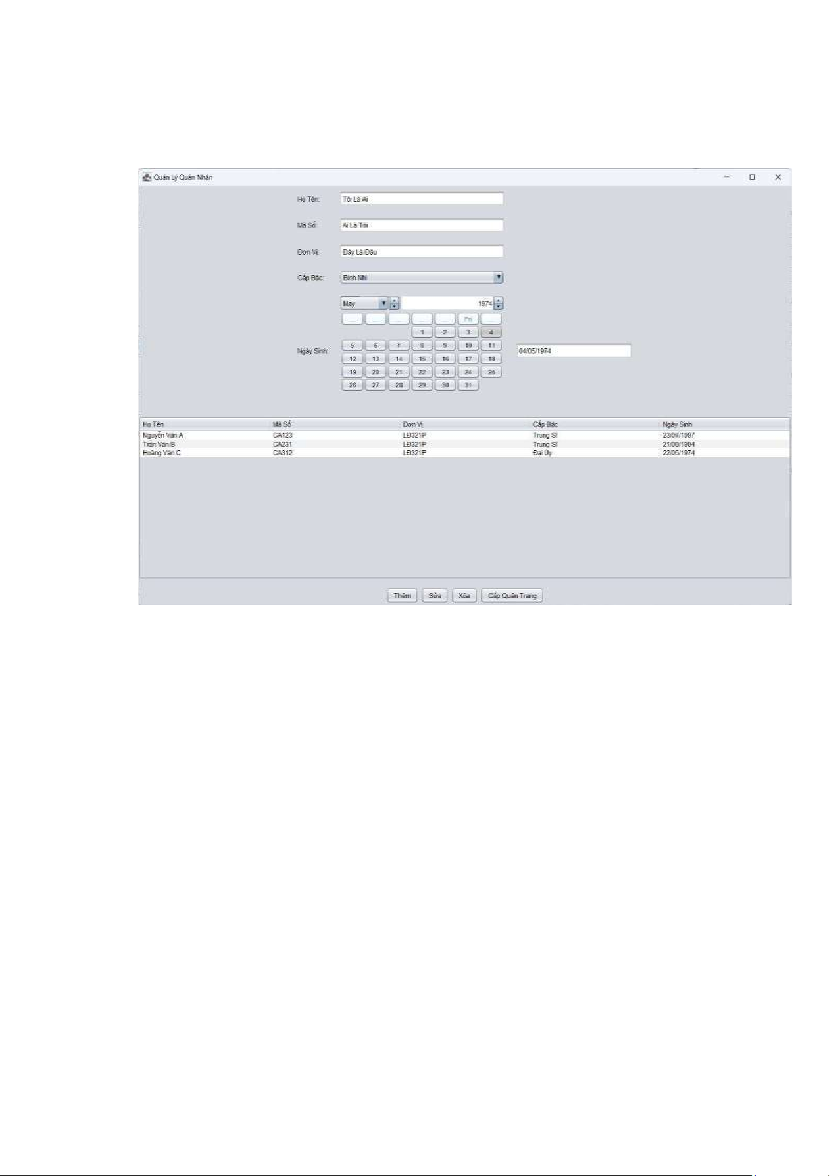 Quản Lý Quân Nhân: Màn hình để thêm quân nhân, sửa thông tin quân nhân hoặc xóa quân nhân.