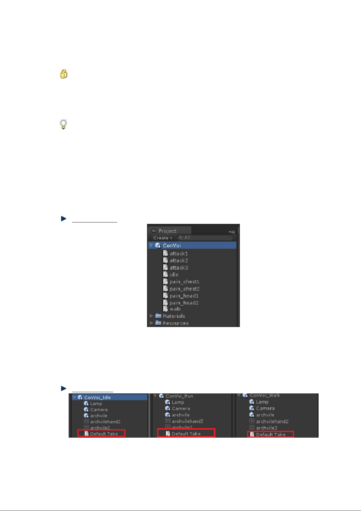 Trong 3 mô hình trên, mỗi mô hình sau khi import có một AnimationClip duy nhất có