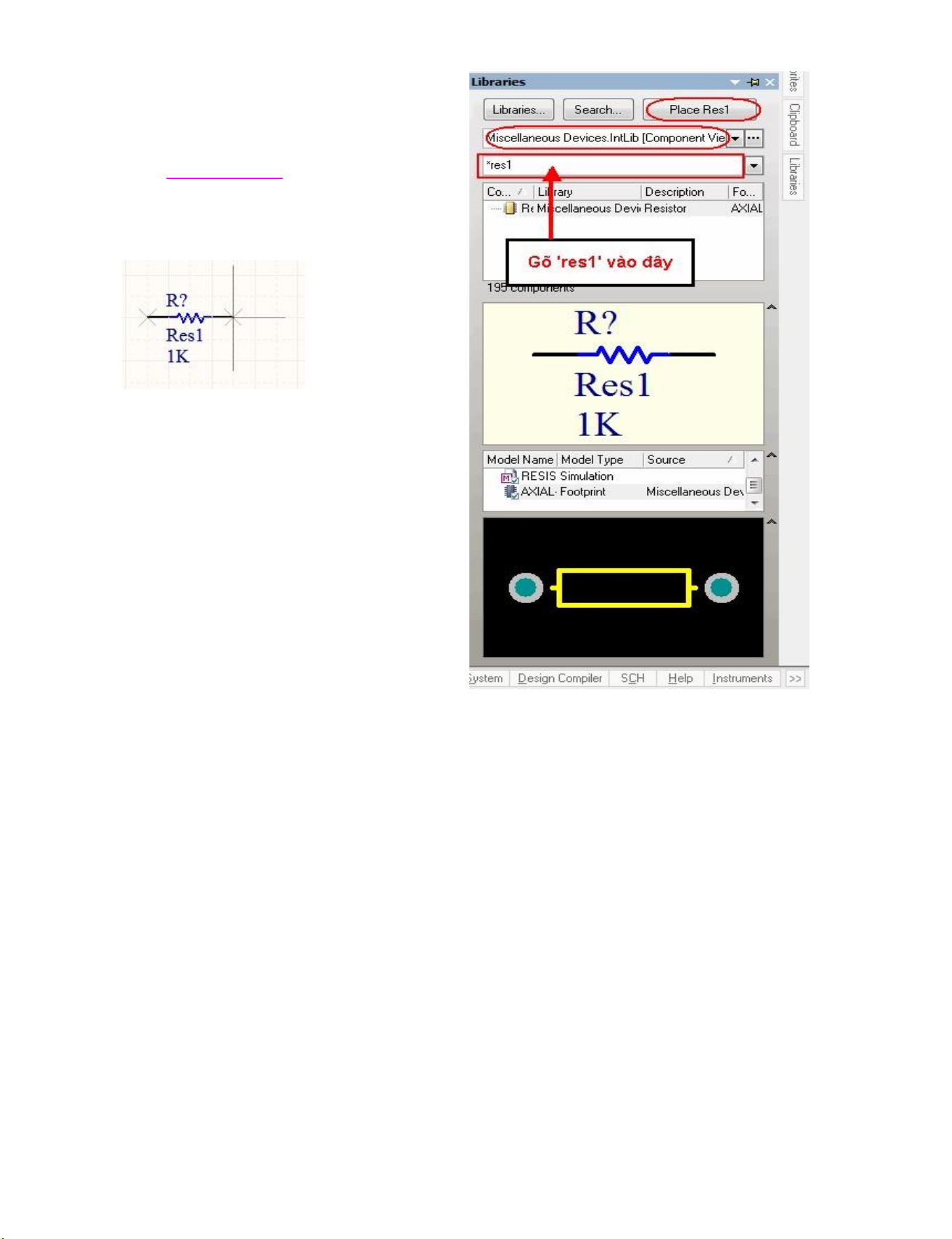 trên bản vẽ rồi đặt liên tiếp 4 điện trở này. Để kết thúc lấy Res1 ta bấm phím ESC. Có 1 điểm cần
