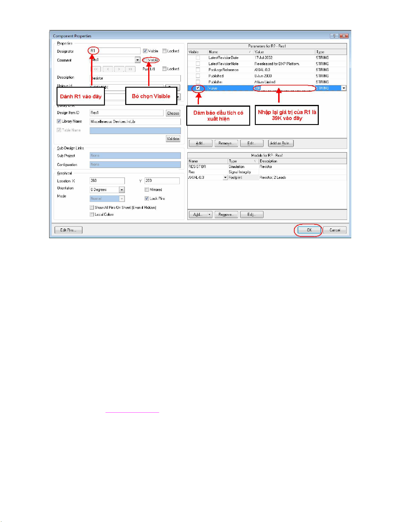 mục Parameter for R?-Res1, khung Value thay 1Kbằng giá trị tương nag là 39K. Và cần đảm