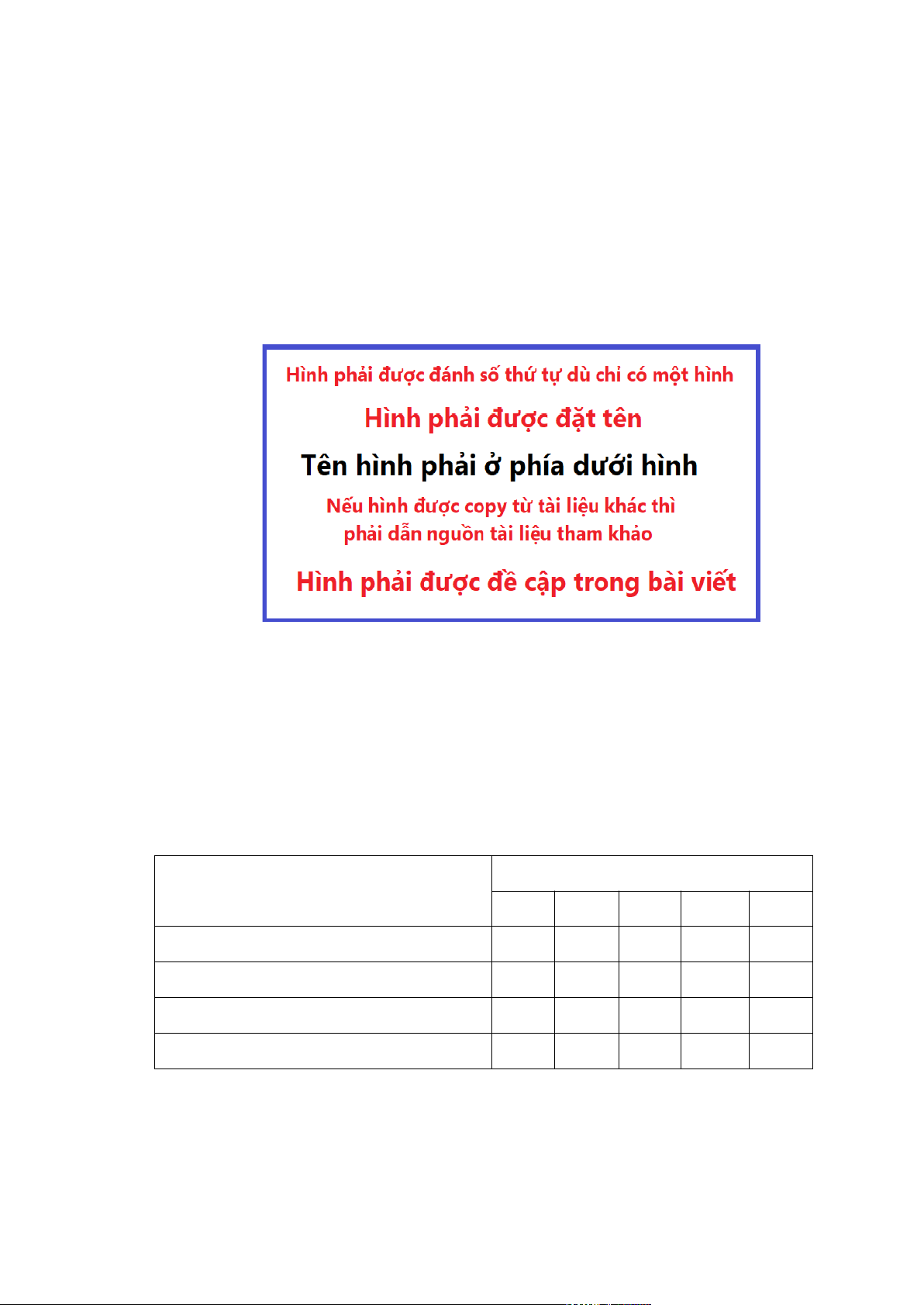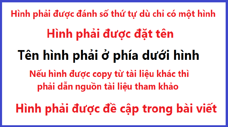 - Các bảng phải được đánh số, đặt tên, dẫn nguồn tài liệu tham khảo (nếu có), và tên hình phải được đặt phía trên hình như trình bày ở Bảng 1.1. Bảng phải được đề cập trong bài viết (như ở câu trước). Các chữ số thập phân trong bài viết, trong hình và trong bảng phải được viết với số chữ số có nghĩa hợp lý. Nếu phù hợp, các số liệu phải có đơn vị đo. [2]