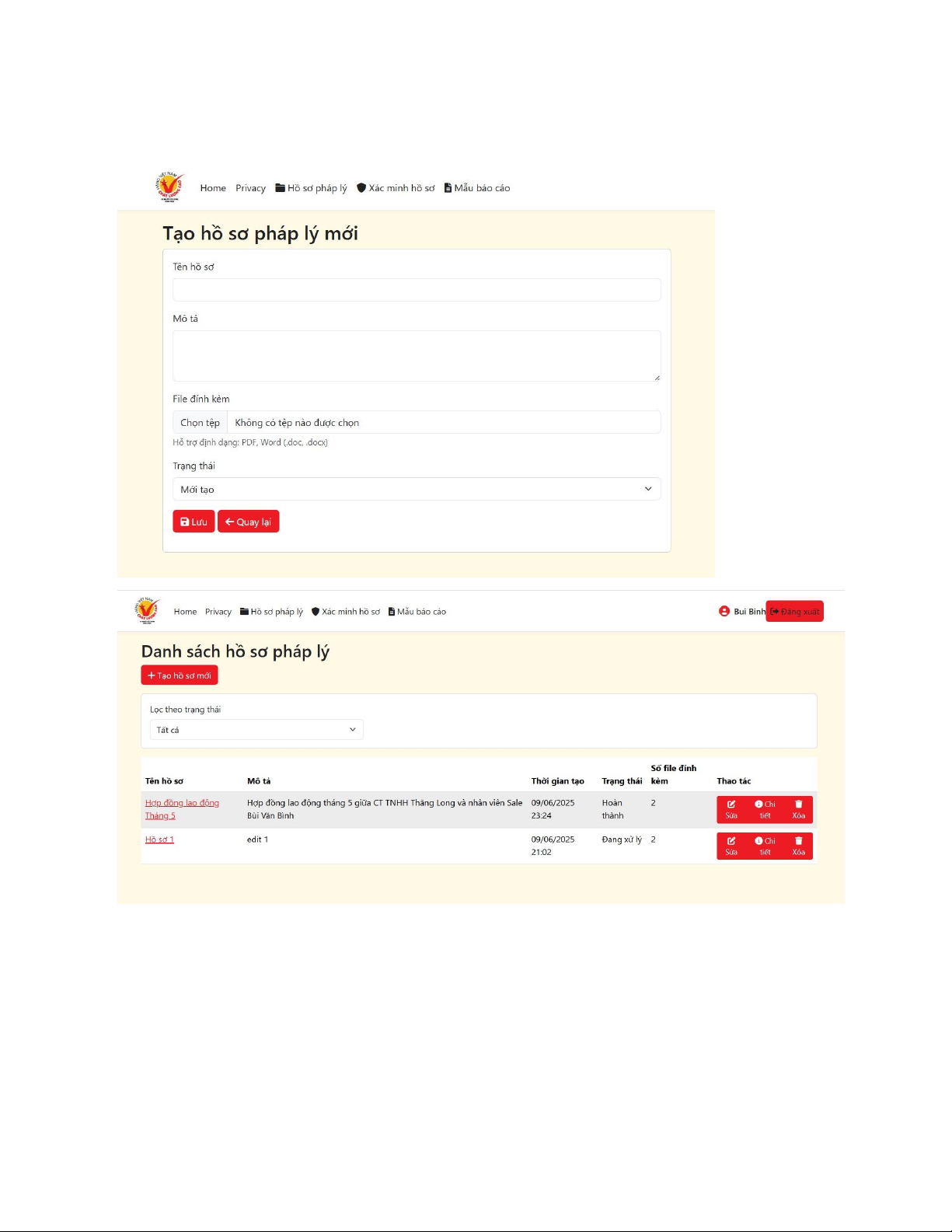 Tạo, xem, cập nhật, xóa hồ sơ; upload file; lưu trạng thái, metadata, lịch sử. 3 Xác minh hồ sơ