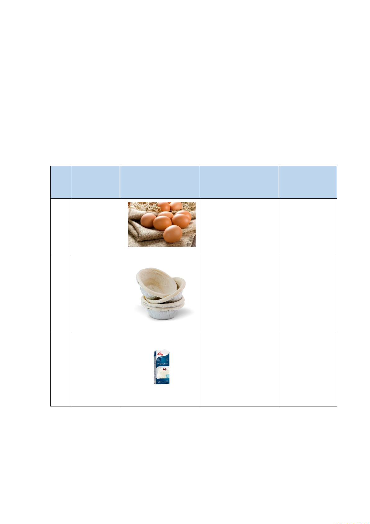 Bảng 1. Thành phần của Bánh Tart.