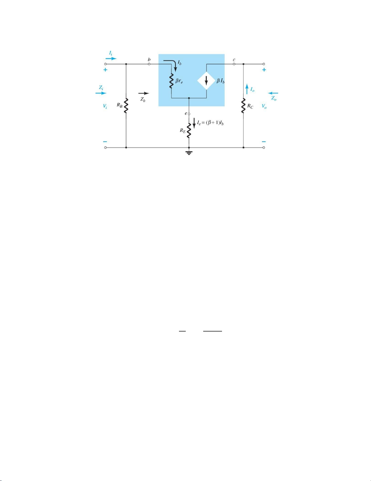 The voltage gain 𝐴𝑉 with substituting 𝑍𝑏 ≈ (𝑅𝐸 + 𝑟𝑒 )β gives 𝑉𝑜 𝑅𝑐 𝐴𝑉 = = − 𝑉 𝑖 𝑅 𝐸+ 𝑟𝑒